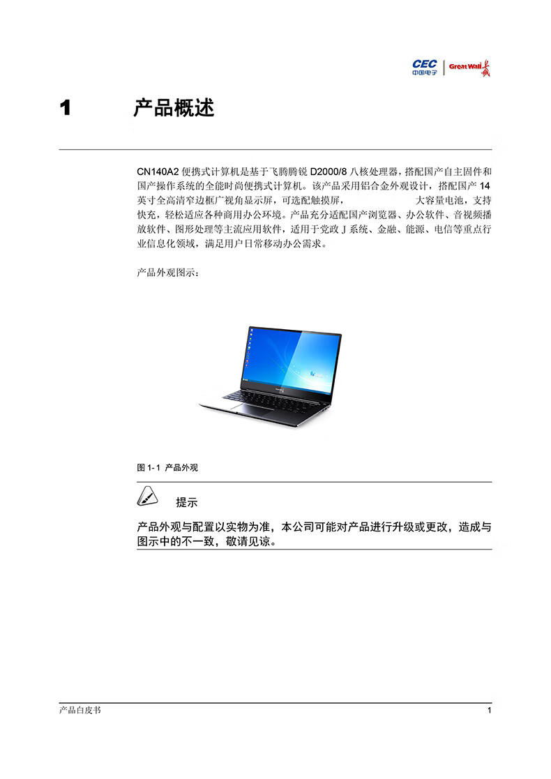 电脑、办公  > 电脑整机  > 笔记本  >  长城/Great Wall  >  长城国产化信创笔记本 CN140A2 飞腾D2000/16G/512G/2G/14吋/3年保修/麒麟国防系统永久激活3年服务 CN140A2/台