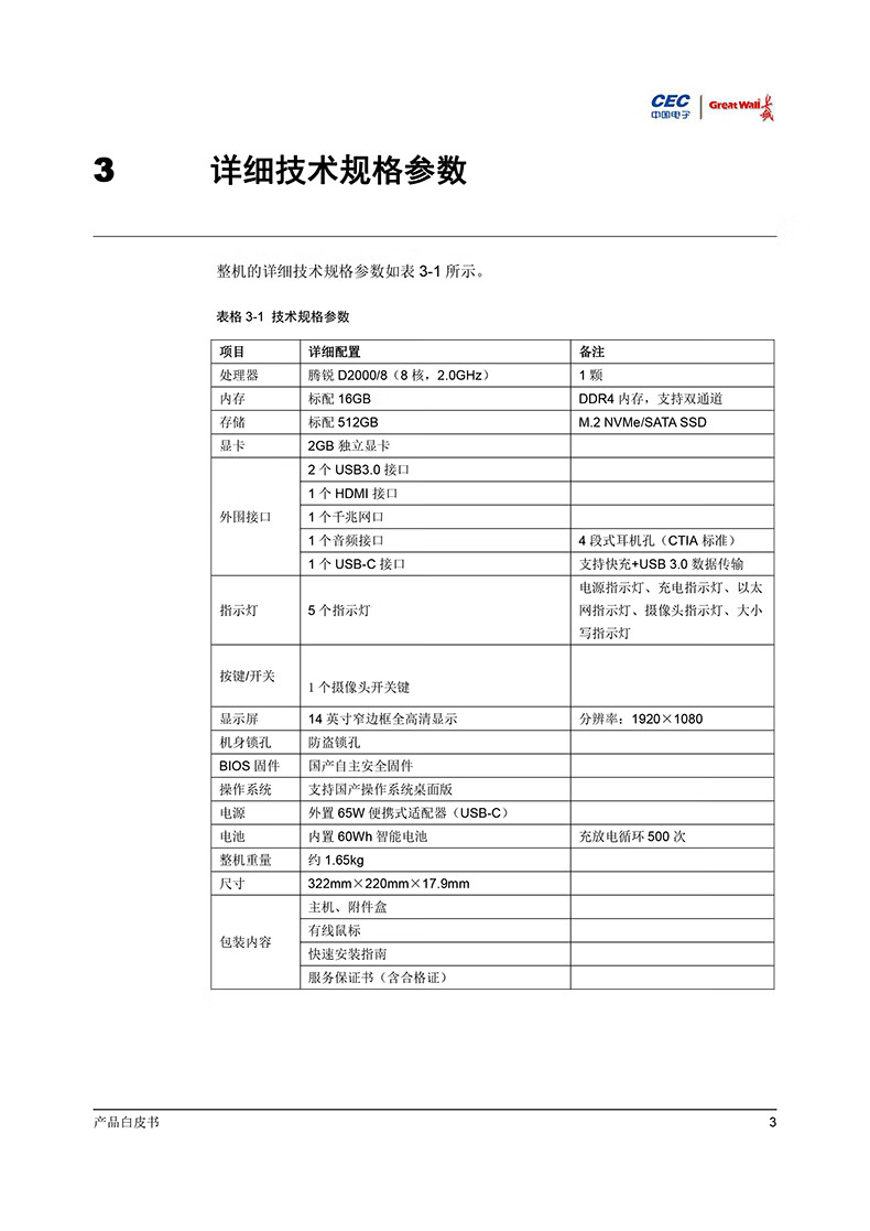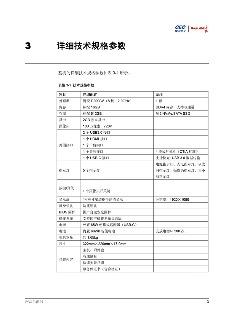 长城国产化信创笔记本 CN140A2 飞腾D2000/16G/512G/2G/14吋/3年保修/麒麟国防系统永久激活3年服务 CN140A2/台