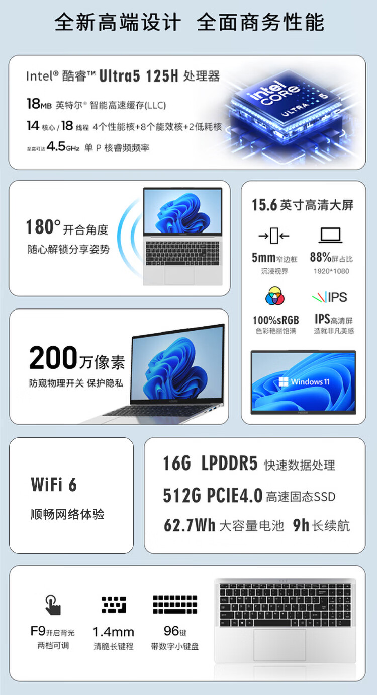 • 商品名称:神舟(HASEE)优雅X5-15.6英寸轻薄本办公本笔记本电脑(酷睿Ultra5 125H 16GB 512G WiFi6)银 优雅X5/个