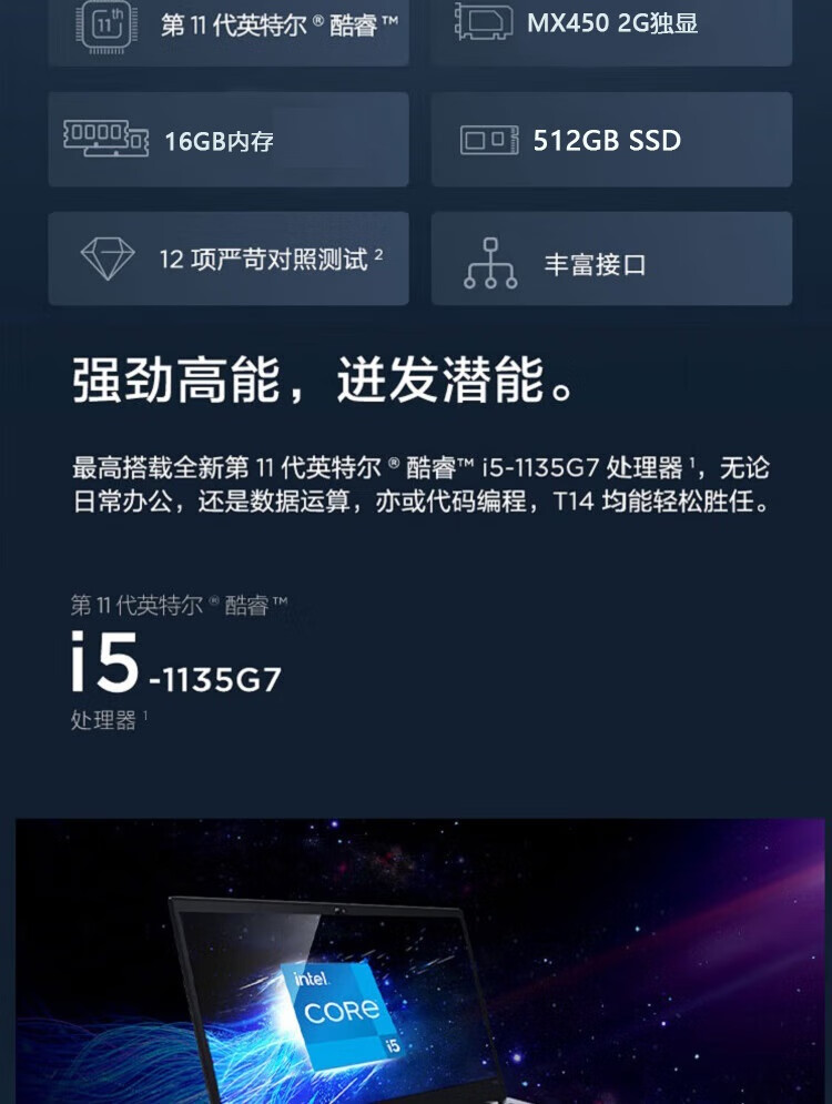 电脑、办公  > 电脑整机  > 笔记本  >  ThinkPad  >  ThinkPad 联想 T14 14英寸高性能轻薄本商务办公笔记本电脑 i5-1135G7 16G 512G 2G独显 红外摄像头 T14/台