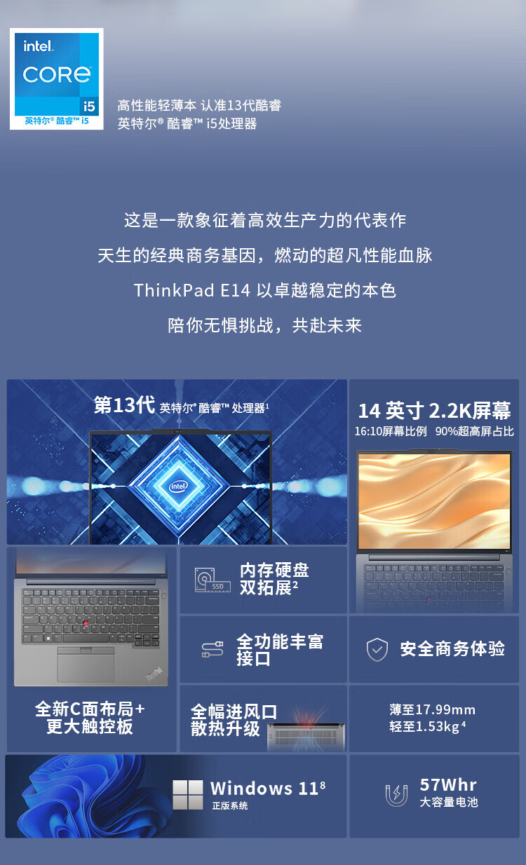 商品名称: 联想ThinkPad E14笔记本电脑 14英寸便携商务办公学生轻薄本 酷睿i5-13500H 16G 1T 2.2K 100%sRGB ThinkPad E14/台