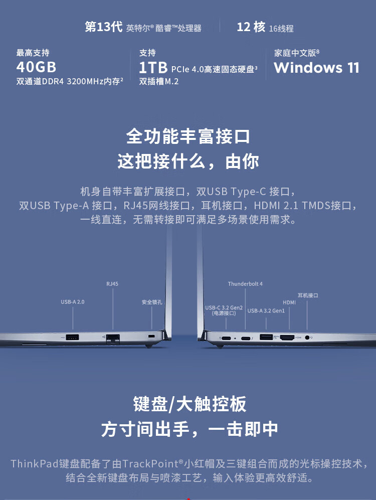 • 商品名称:联想ThinkPad E14笔记本电脑 14英寸便携商务办公学生轻薄本 酷睿i5-13500H 16G 1T 2.2K 100%sRGB ThinkPad E14/台