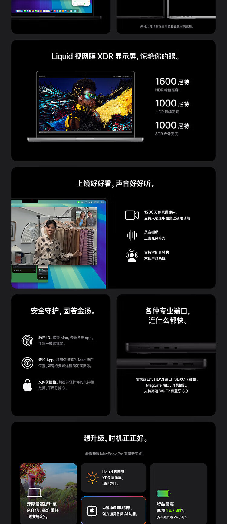 • 商品名称:Apple/苹果 MacBook Pro 14.2英寸 AI笔记本电脑 M4(10核CPU+10核GPU)16GB内存 512GB固态硬盘 深空黑 MacBook Pro/台