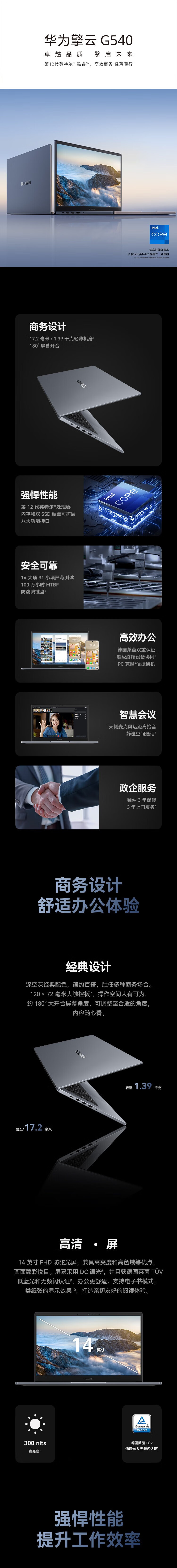 商品名称: 华为(HUAWEI)擎云 G540 14吋轻薄商务笔记本(i5-1240P 40G 2TSSD 56Wh TPM加密芯片 )WIN10专业版 深空灰 定制 擎云 G540/台