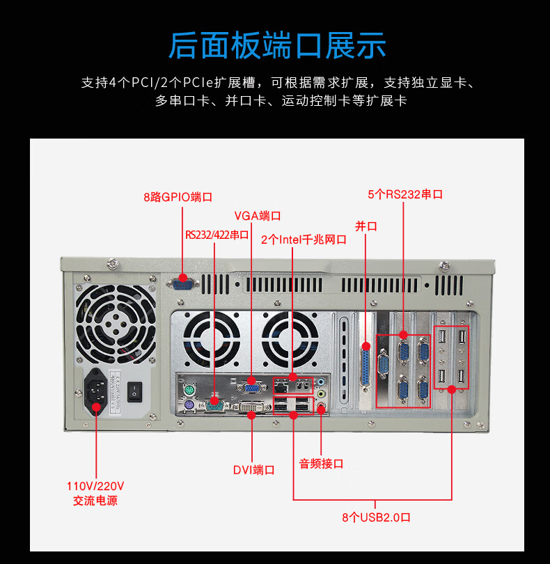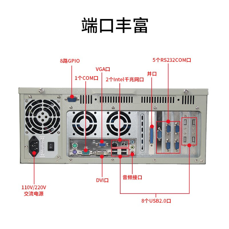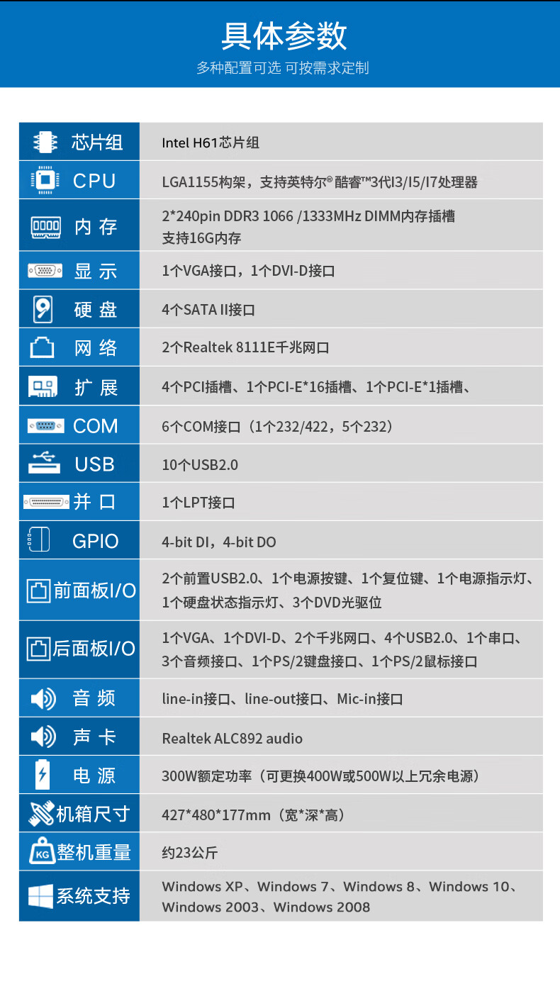 包装清单: 工控主机x1 电源线x1 螺丝x1 键鼠x1 插排x1 装箱单x1 保修卡x1 合格证x1