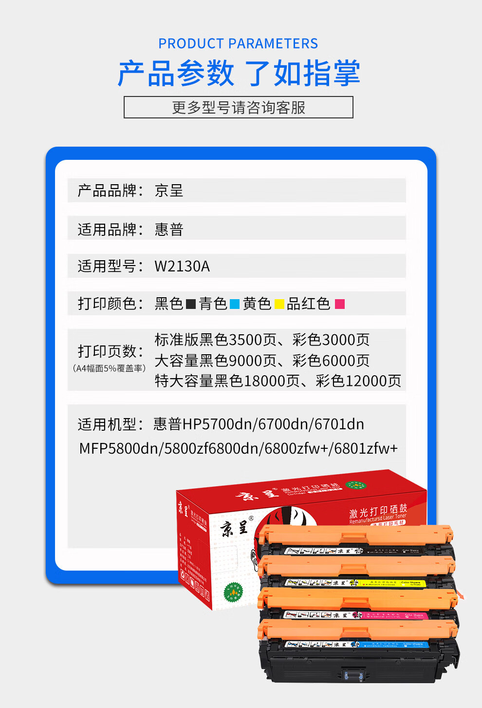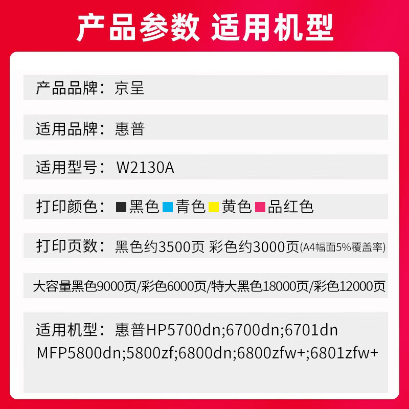 电脑、办公  > 办公耗材  > 硒鼓  >  京呈  >  京呈W2130A硒鼓适用惠普5700dn 6700dn 6701墨粉5800 6800zfw+彩色打印机 【9000页】W2130X 大容量黑色硒鼓 W2130A/支