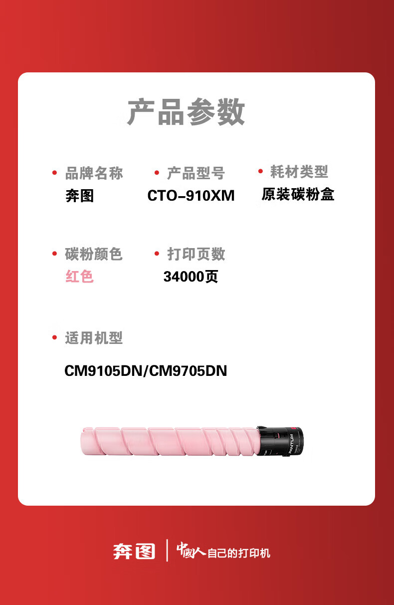 商品名称: 奔图CTO-910XM原装高容量粉盒34000页 红色碳粉盒 适用于奔图CM9105DN/CM9705DN打印机耗材 碳粉盒 硒鼓 CTO-910XM/个