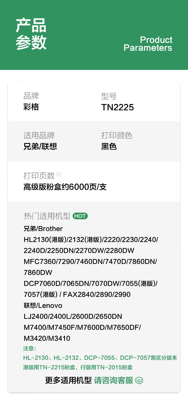 • 商品名称:彩格TN2225粉盒适用兄弟MFC7360 7470D 7860DN硒鼓DCP7057 7060D FAX2890HL2240D 2250DN TN2215 TN420打印机墨盒 TN-2225/支