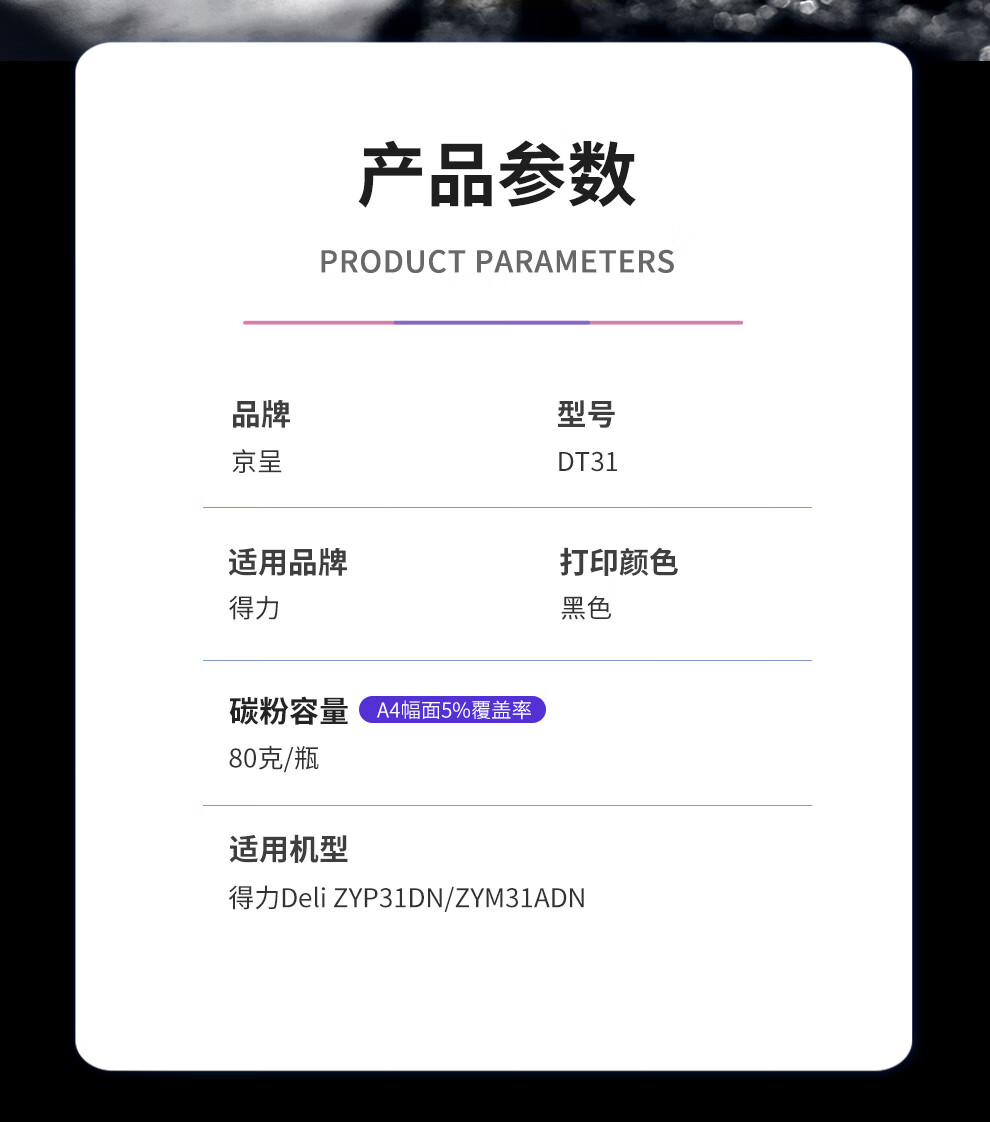 商品名称: 京呈DT31硒鼓适用得力ZYP31DN ZYM31ADN M28D 28DN 28ADN打印机碳粉盒 高清碳粉 80g/瓶 DT31/瓶
