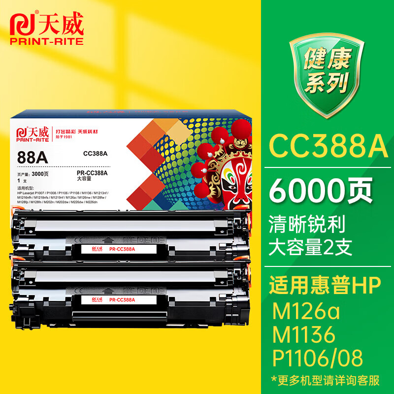 电脑、办公  > 办公耗材  > 硒鼓  >  天威/PRINT-RITE  >  天威M1136硒鼓2支装388A大容量适用惠普88A硒鼓CC388A HP P1106 P1108 P1007 M126a M128fn M128fw打印机墨盒 CC388X/个
