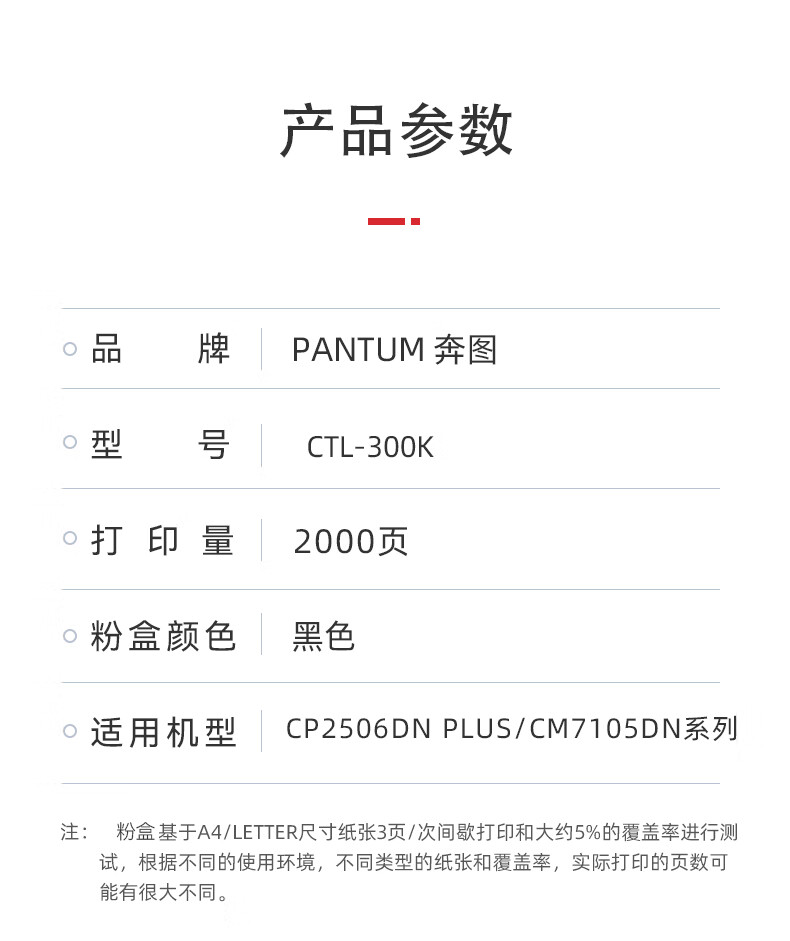 • 商品名称:奔图(PANTUM)CTL-300K黑色粉盒 适用CP2506DN PLUS/CM7105DN (2000页) CTL-300K/个