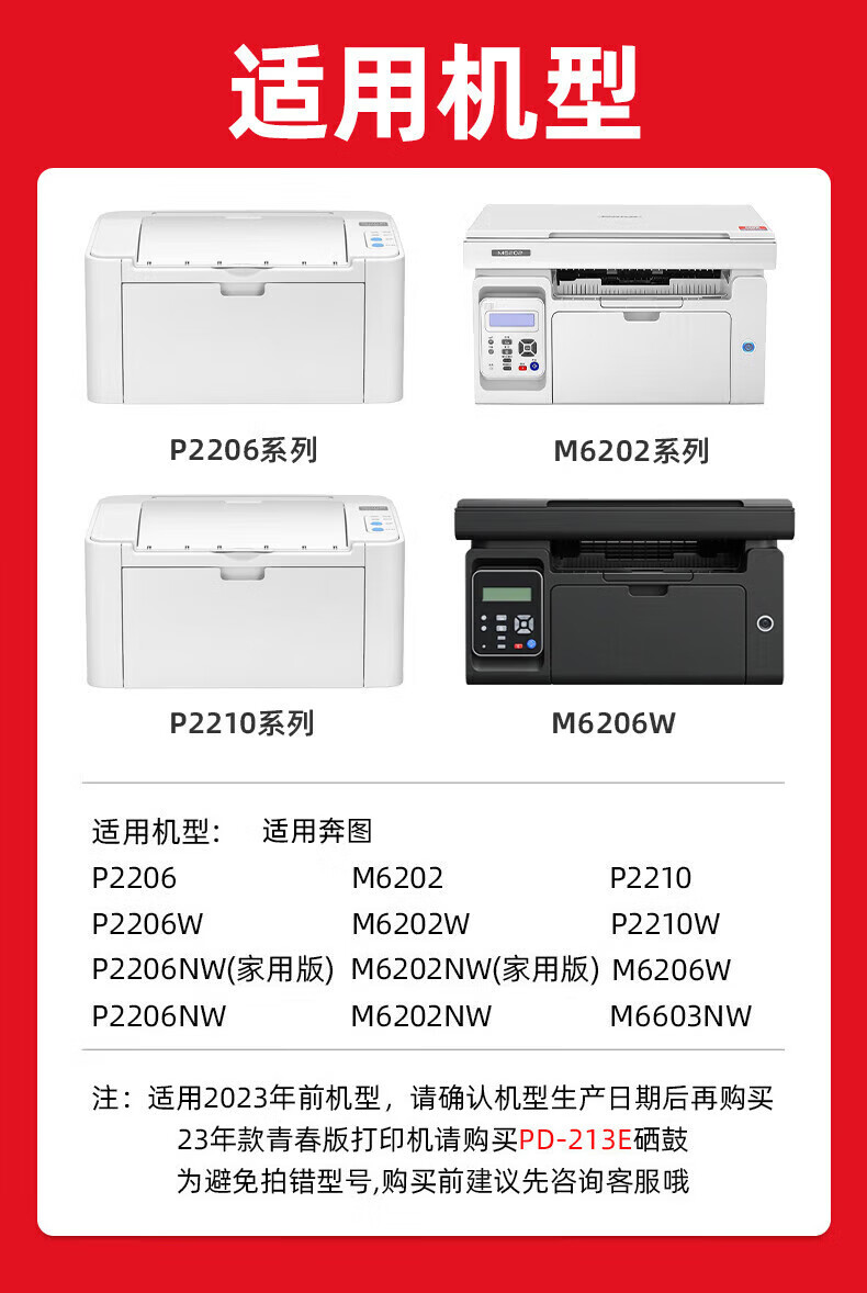 • 商品名称:绘威适用奔图m6202nw硒鼓PD-213粉盒p2206nw p2206w m6202w易加粉M6603nw M6206w P2210W 奔腾打印机墨盒pd213 硒鼓/支