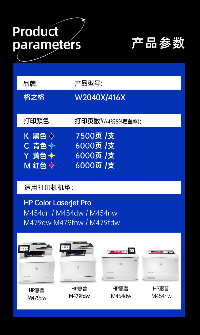 • 商品名称:格之格416a硒鼓适用惠普m479dw硒鼓 m479fdw m454dw m479fnw m454dn hp w2040a硒鼓大容量无芯片 25500页 四色套装 NT-PNH416X无芯片网络专供升级版四支套装/个