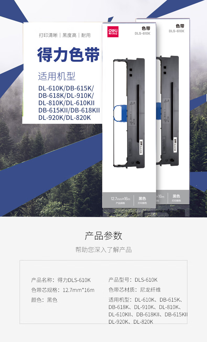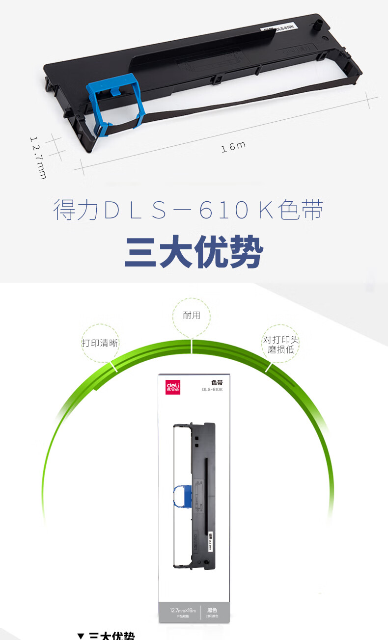 • 商品名称:得力(deli)DLS-610K大容量针式打印机黑色色带 16米带芯(适用DB-618K,DB-618KⅡ) DLS-610K/个