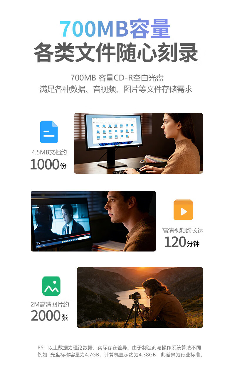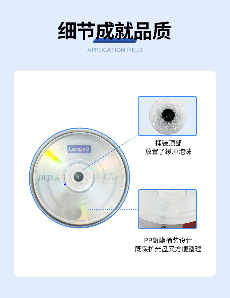 包装清单: 联想(Lenovo)CD-R 光盘/刻录盘 52速700MB 办公系列 桶装50片 空白光盘*1