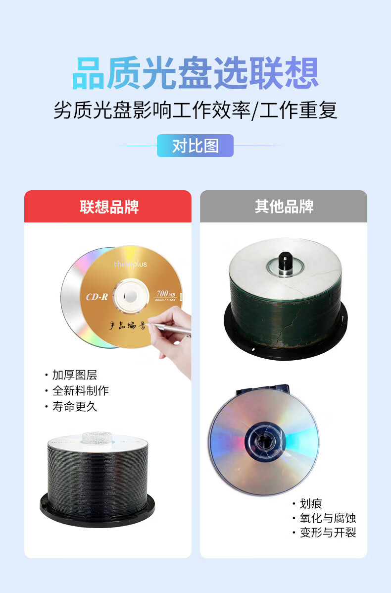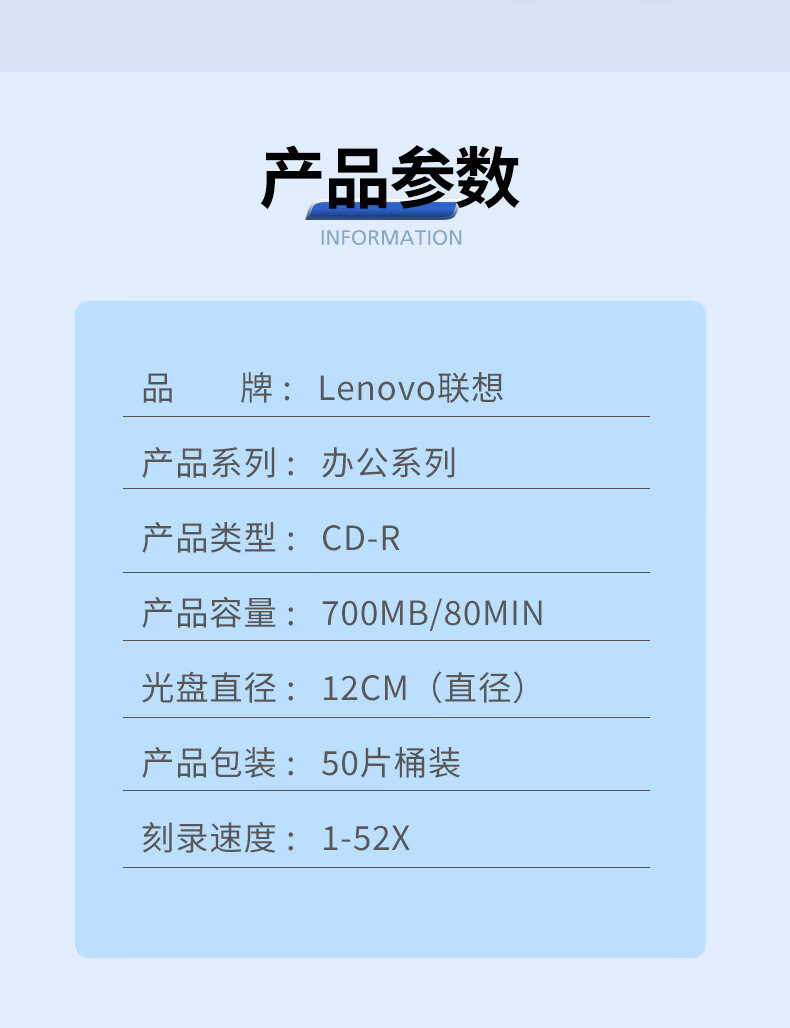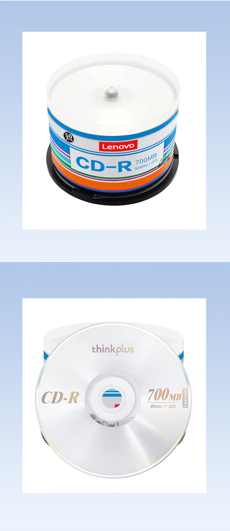 • 商品名称:联想(Lenovo)CD-R 光盘/刻录盘 52速700MB 办公系列 桶装50片 空白光盘 CD-R/桶