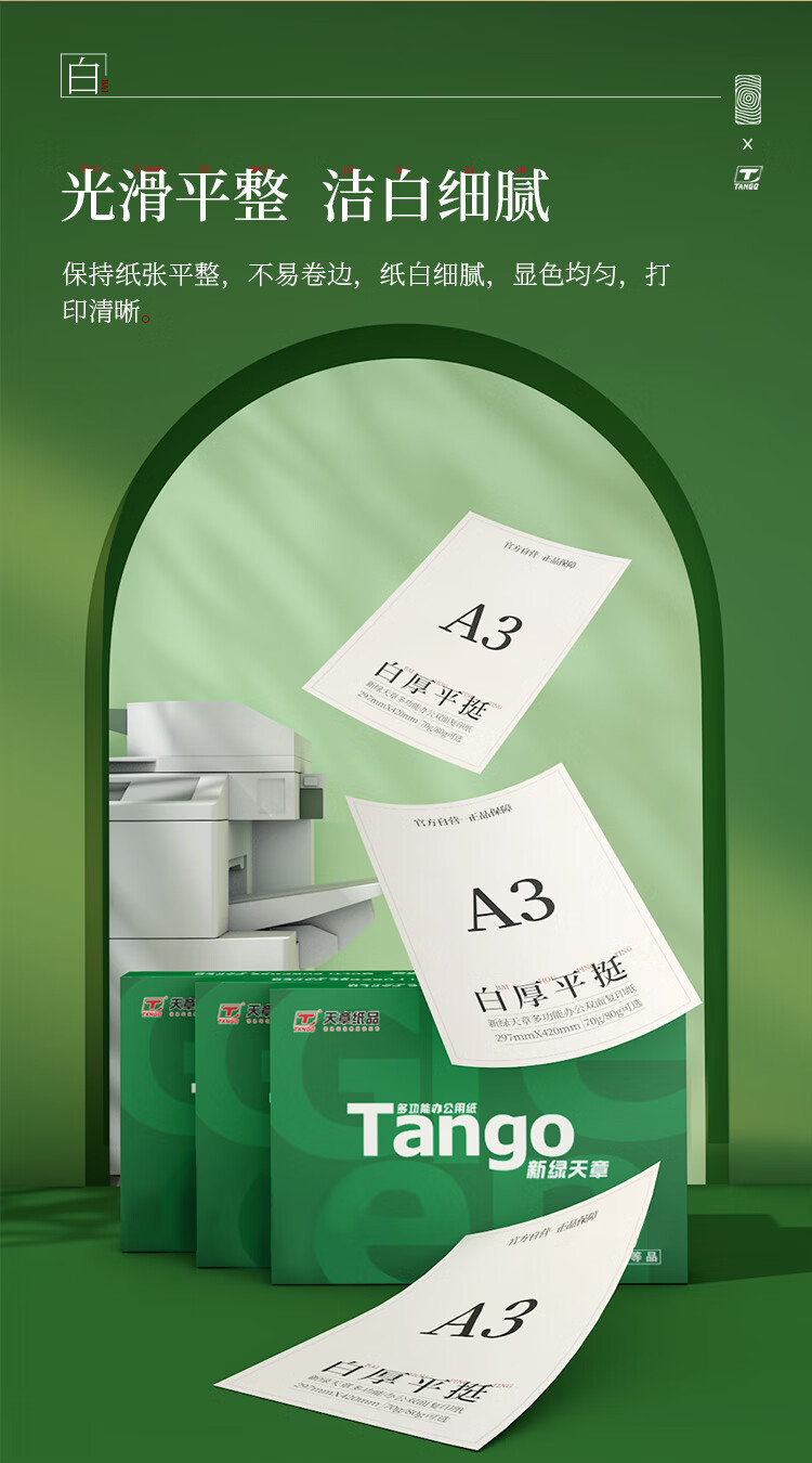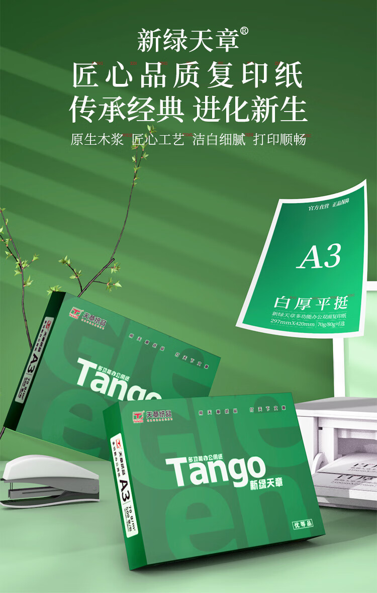 • 商品名称:天章 (TANGO)新绿天章A3打印纸70g 500张*5包 (297*420mm) 工程绘图纸 手抄报画纸复印纸 整箱2500张【品质款】 新绿天章70克A3/箱