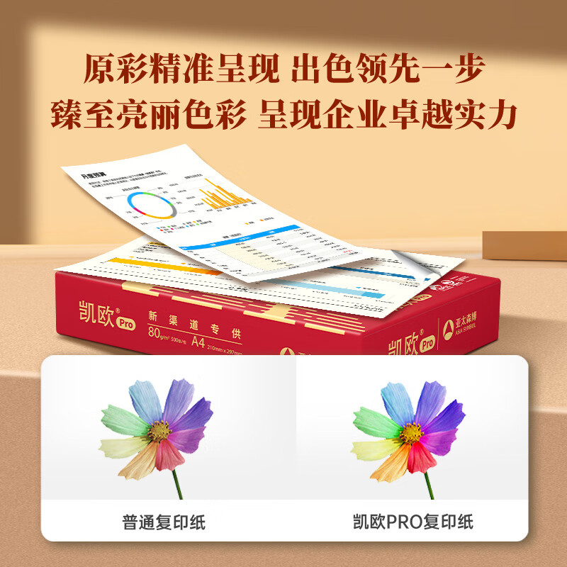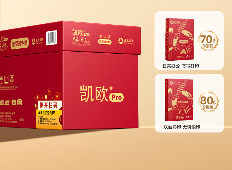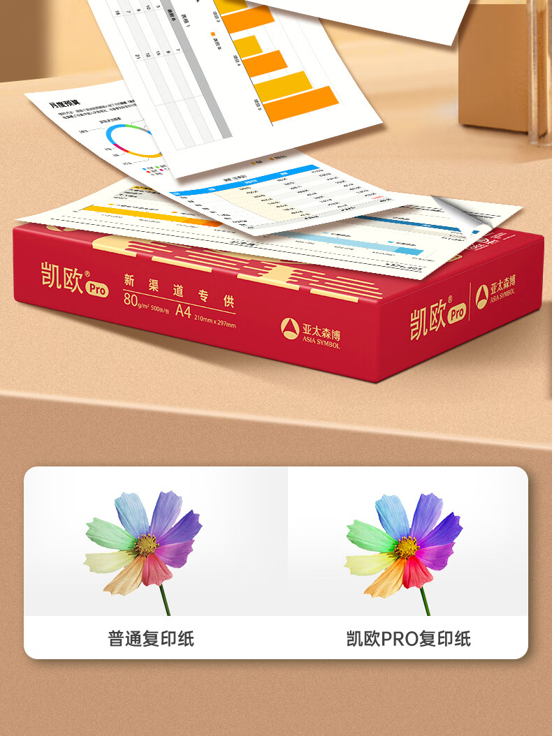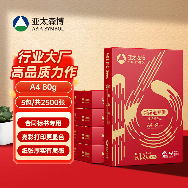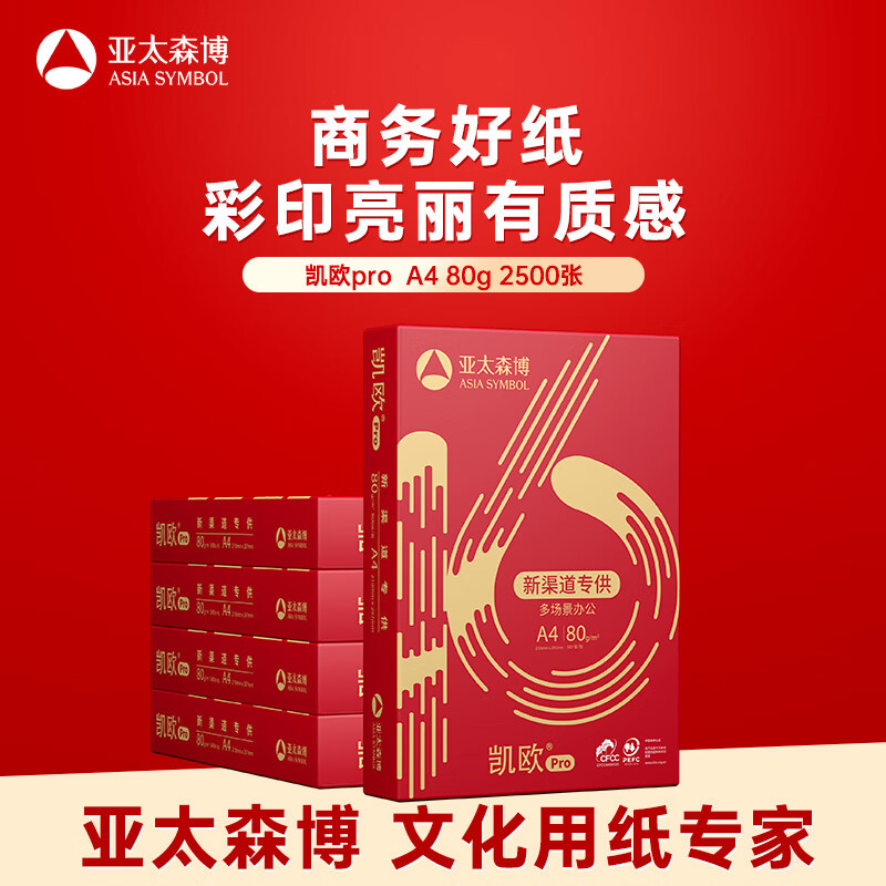 电脑、办公  > 办公耗材  > 纸类  >  亚太森博  >  亚太森博 凯欧Pro 80g A4复印纸 500张/包 5包/箱(2500张)高端商务品质 合同标书彩打 A4 80g/箱
