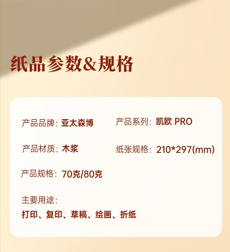 • 商品名称:亚太森博 凯欧Pro 80g A4复印纸 500张/包 5包/箱(2500张)高端商务品质 合同标书彩打 A4 80g/箱