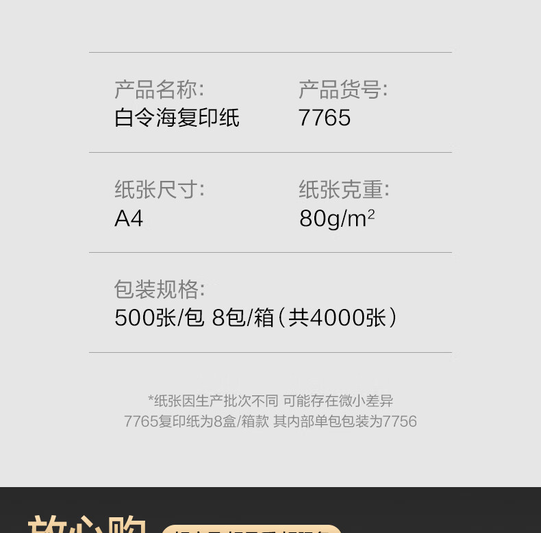 包装清单: A4-80g复印纸×1箱(8包 4000张)