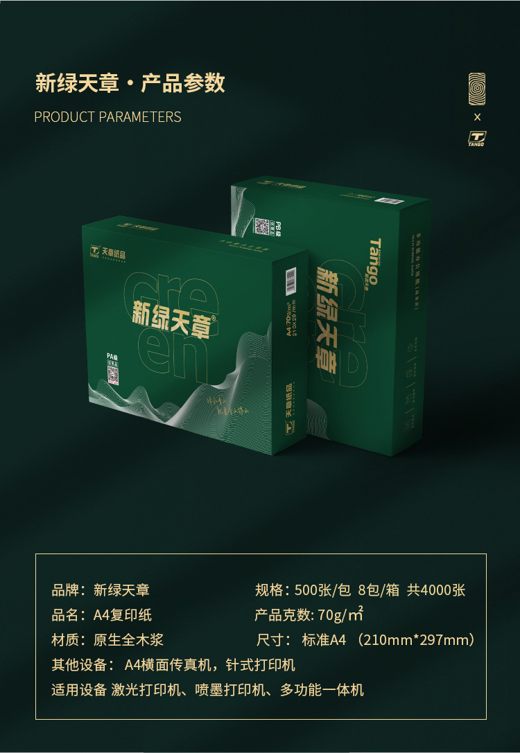 商品名称: 天章 (TANGO)新绿商务A4打印纸 70g 500张*8包 双面打印复印纸 纸张洁白顺滑畅打 整箱4000张【合同标书款】 新绿天章商务款70gA4 8包/箱