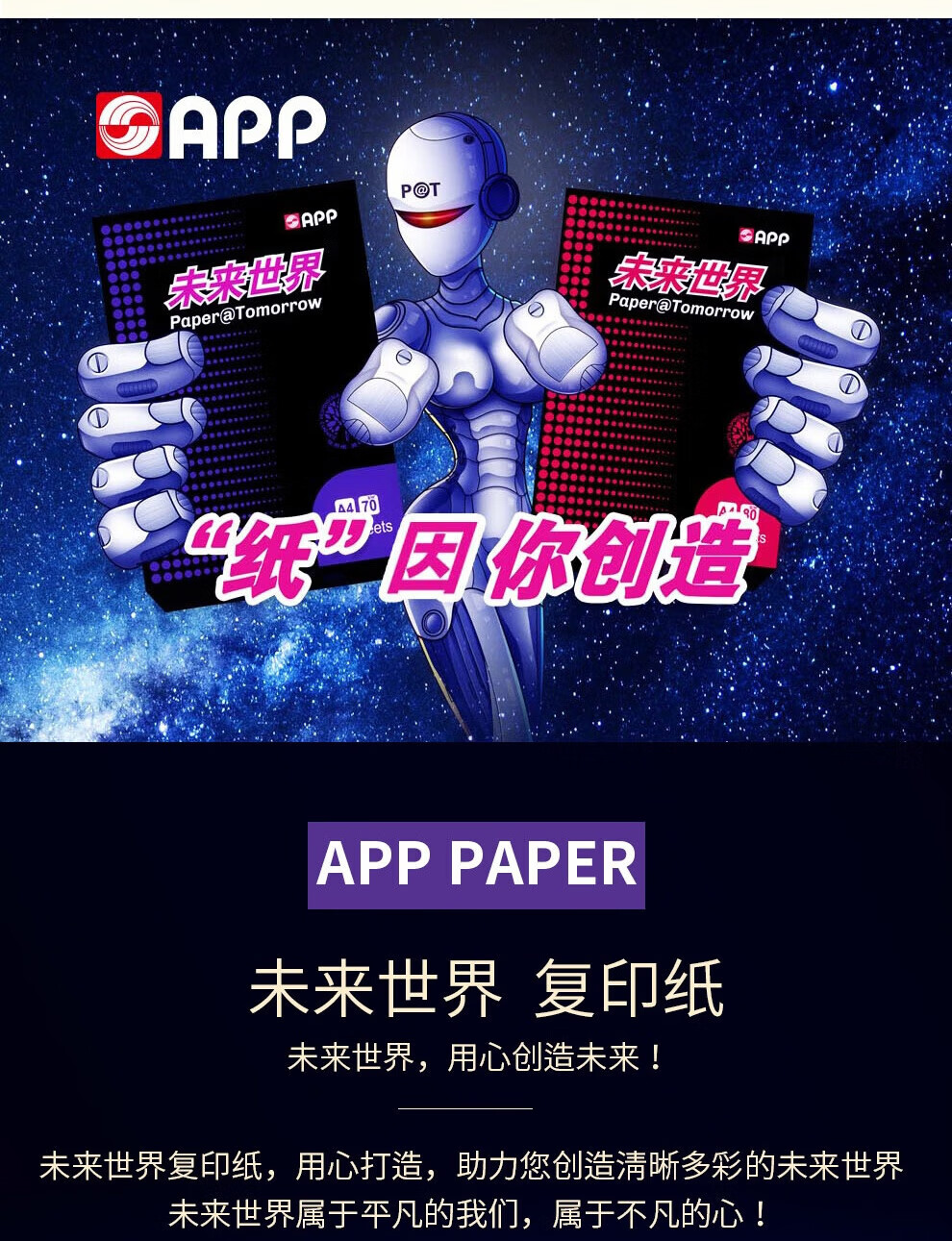 电脑、办公  > 办公耗材  > 纸类  >  APP  >  APP 金光APP 未来世界(paper@tomorrow) A4/80g 高档A4纸复印纸 500张/包 5包/箱(2500张) 80gA4/箱