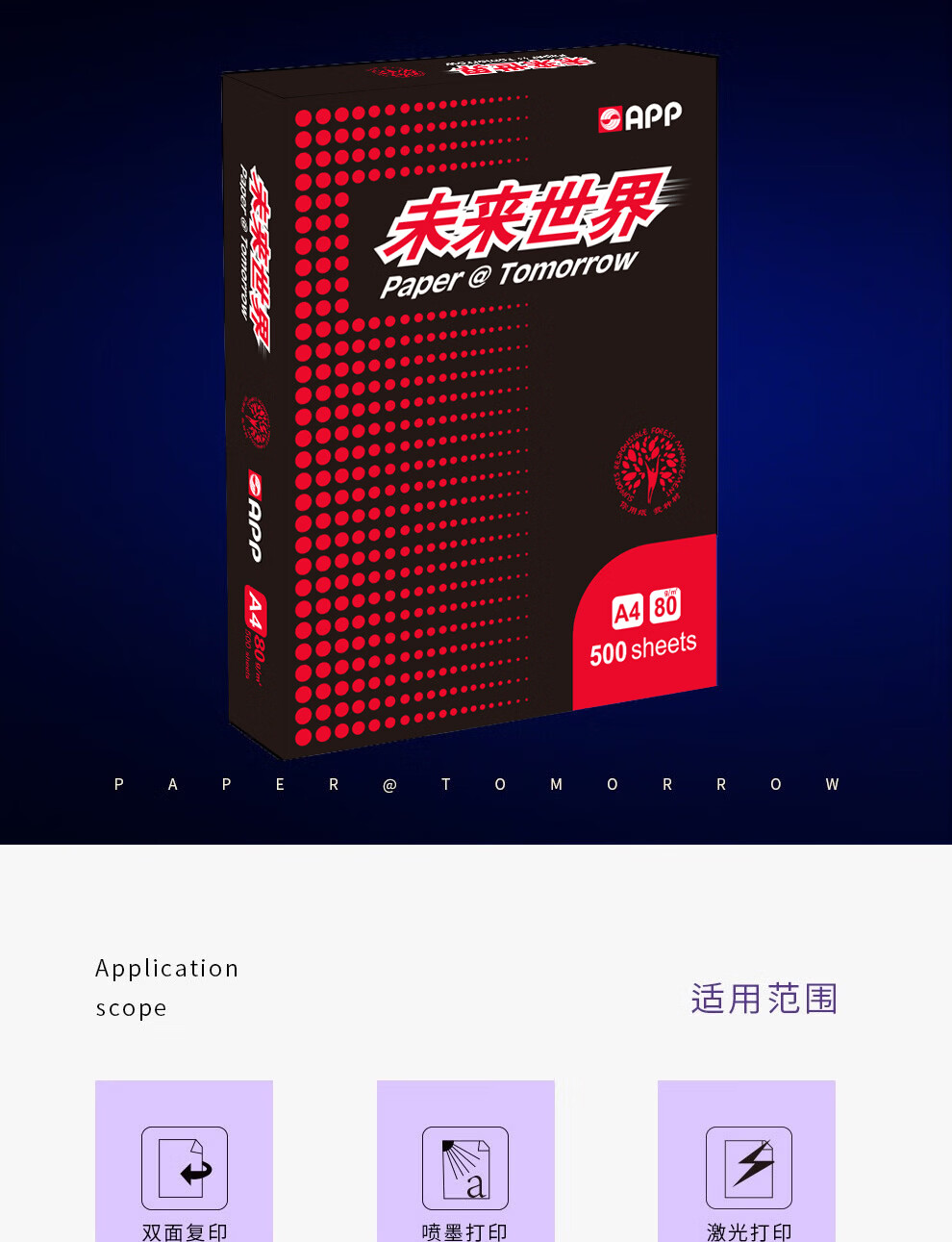 • 商品名称:APP 金光APP 未来世界(paper@tomorrow) A4/80g 高档A4纸复印纸 500张/包 5包/箱(2500张) 80gA4/箱