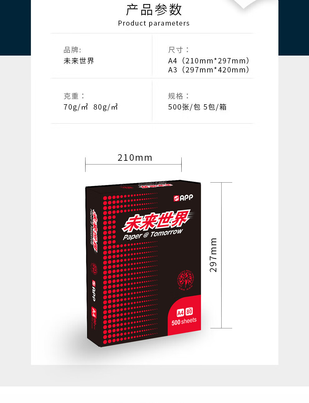 商品名称: APP 金光APP 未来世界(paper@tomorrow) A4/80g 高档A4纸复印纸 500张/包 5包/箱(2500张) 80gA4/箱