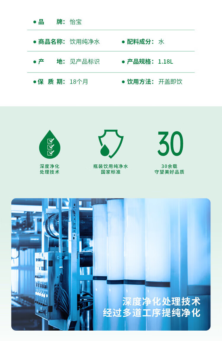 • 商品名称:怡宝饮用水纯净水1.18L*12瓶装 整箱 日常保湿泡茶 饮用水纯净水/瓶