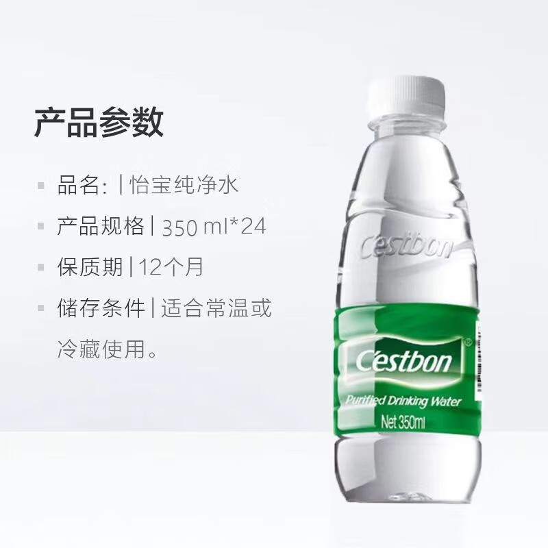 • 商品名称:怡宝纯净水小瓶水会议办公便携350ml*24瓶整箱【30箱套餐 不可拆分】 350ml*24/箱