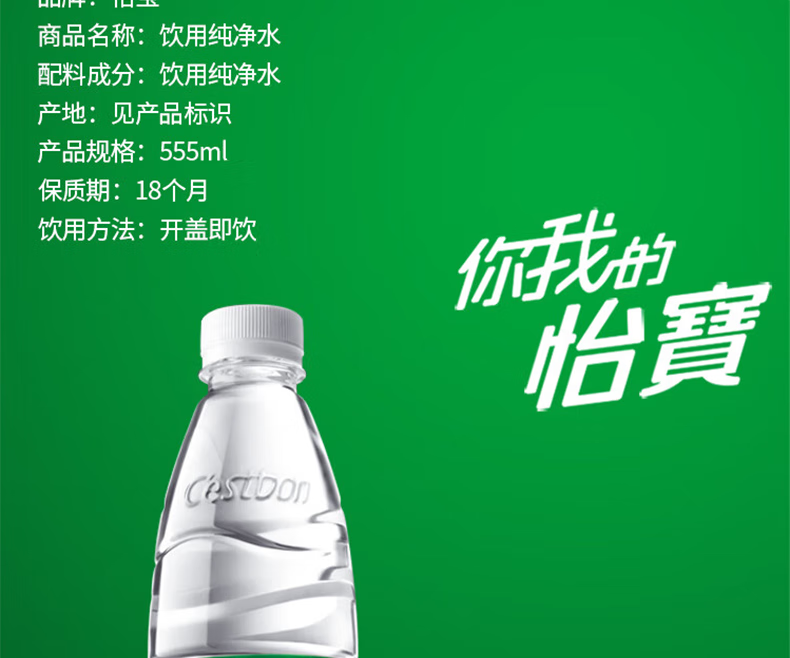 • 商品名称:怡宝纯净水饮用水家庭用水555ml*24瓶整箱装【30箱套餐 不可拆分】 555ml*24瓶/箱
