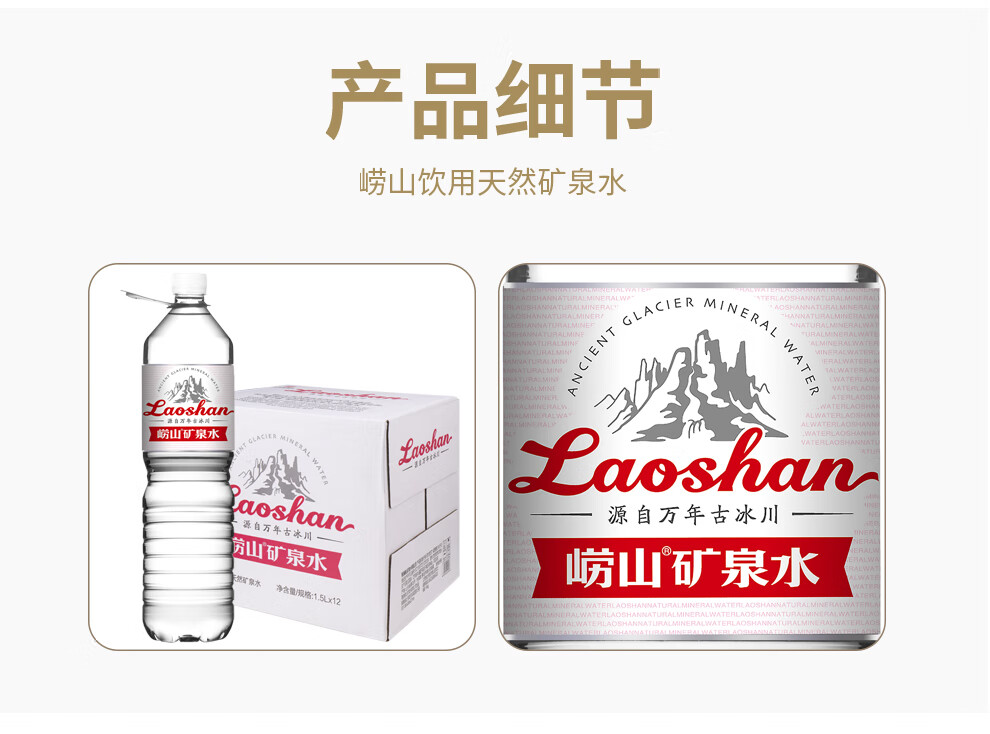 商品名称: 崂山 中华老字号 锶-偏硅酸型饮用天然矿泉水 1.5L*12瓶 热门商品 矿泉水1.5L*12瓶/箱