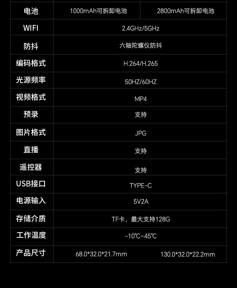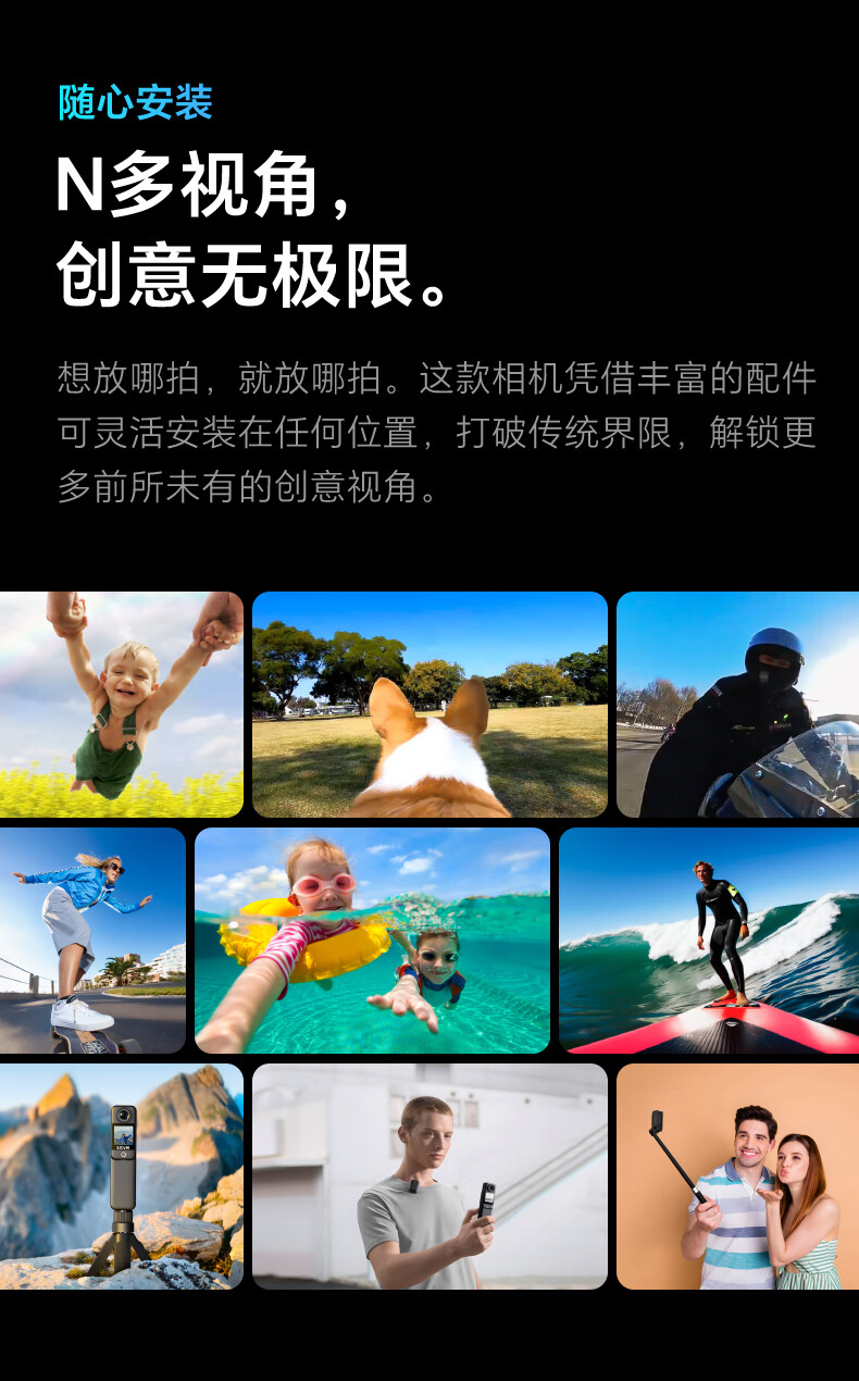 包装清单: 主机,防水壳,边框,背夹,骑行支架,下巴支架,头盔底座,防水充电线,磁吸挂绳,头盔底座,擦拭布,内存卡