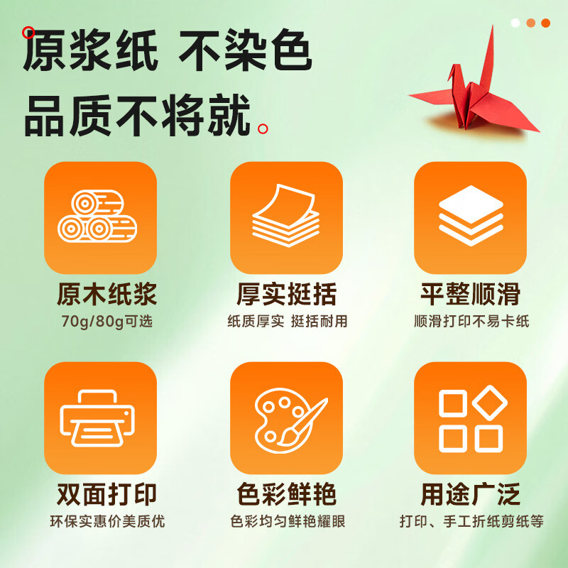 • 商品名称:天章 (TANGO)新绿天章A4彩色复印纸 10色混色打印纸薄卡纸 凭证打印纸 学生手工折剪彩纸 十色混装70g 100张/包 新绿天章彩复A4 10色混色 彩色复印纸 70g 100张/包/包