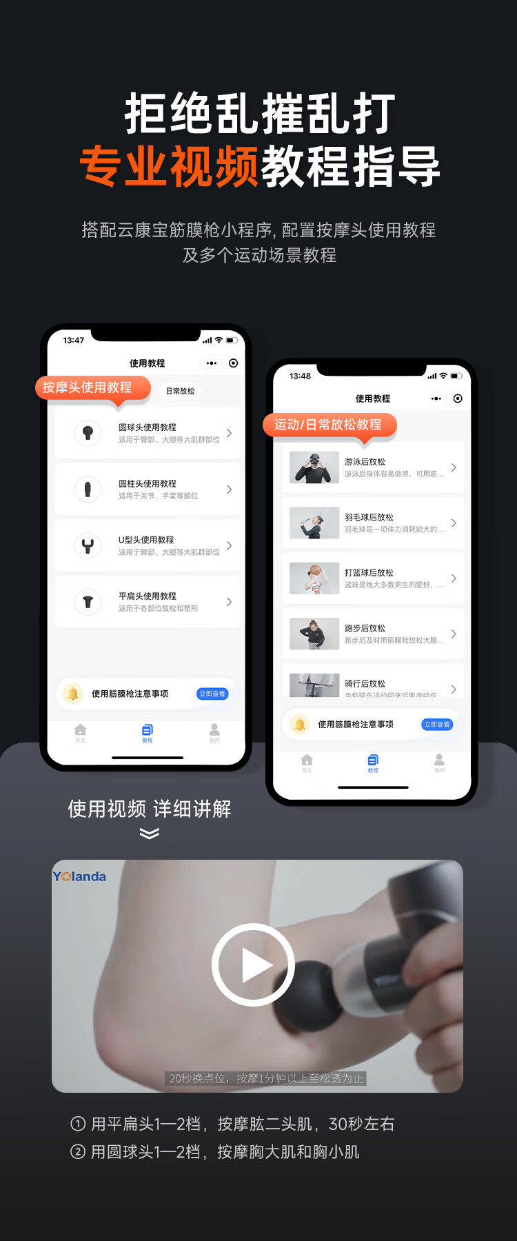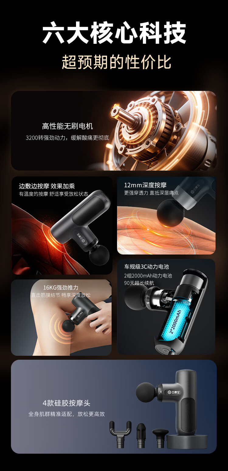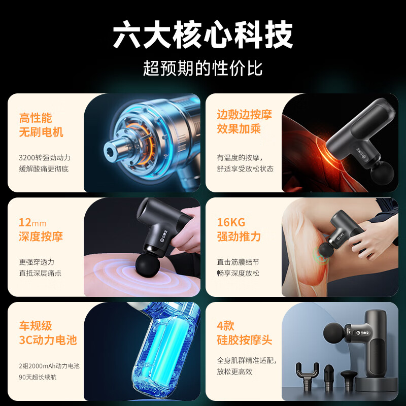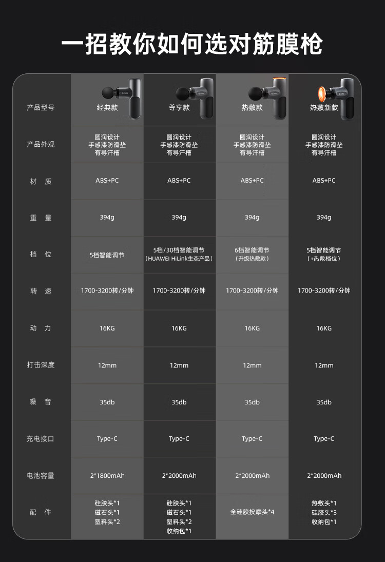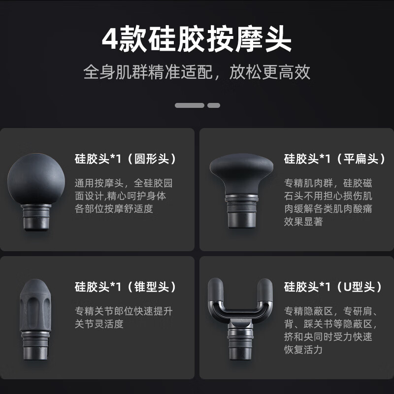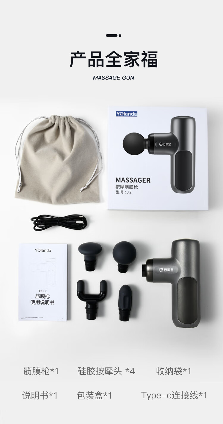 包装清单: 筋膜枪*1,硅胶按摩头*4,收纳袋*1,包装盒*1,Type-c连接线*1,说明书*1