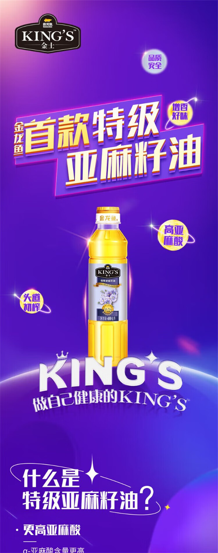 粮油调味  > 食用油  > 其他油  >  金龙鱼  >  金龙鱼KING'S特级亚麻籽油400mL*4 400mL*4/瓶