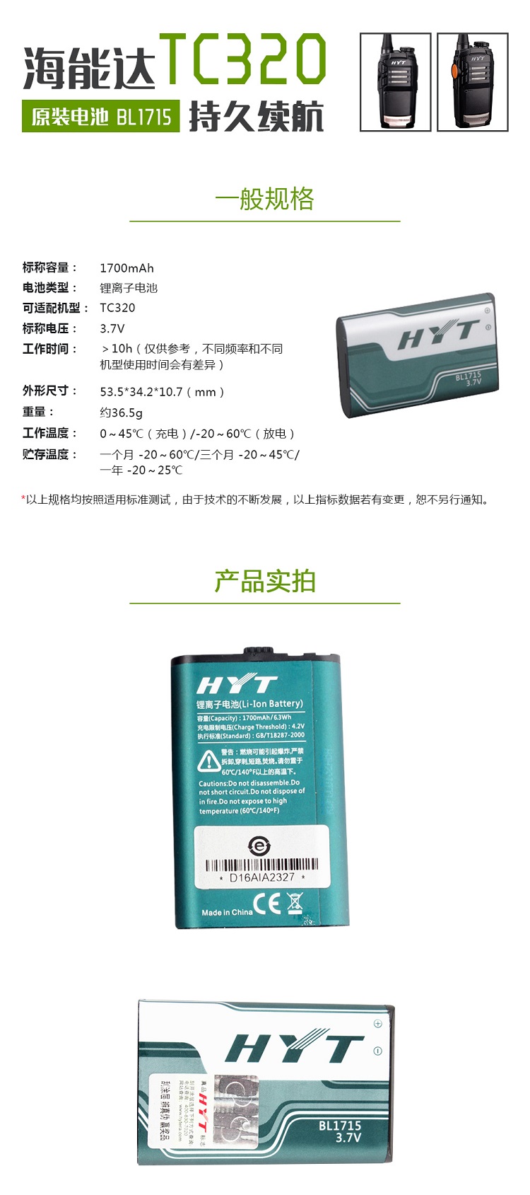 • 商品名称:海能达(Hytera)TC320对讲机电池 BL1715原装锂电池 1700mah 适配好易通TC-320对讲机 BL1715/块