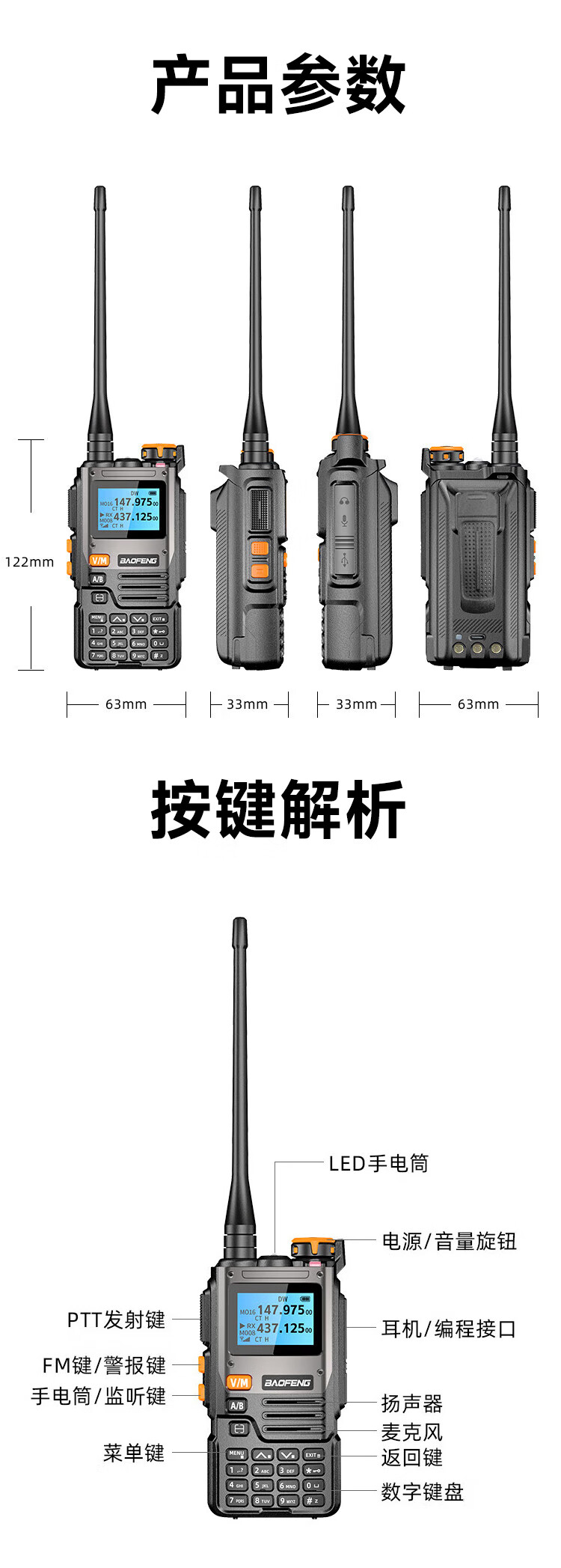 商品名称: 宝锋(BAOFENG)UV-K61 对讲机 一键对频 K6系列升级破码版 UV5R/5RH系列多频段航空频大功率远距离户外自驾手台 UV-K61/台