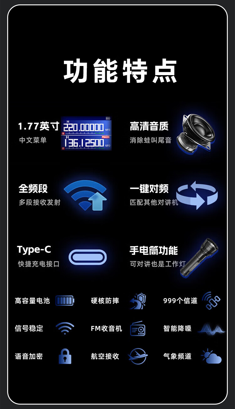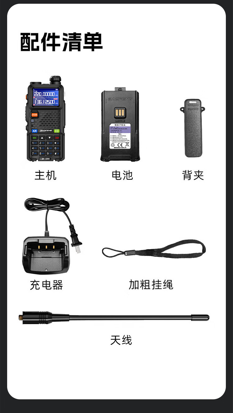 包装清单: 主机*1、电池*1、天线*1、背夹*1、充电座*1、挂绳*1、说明书*1