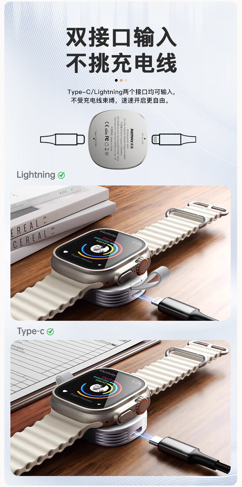 • 商品名称:remax【iwatch全系兼容】苹果手表充电器MagSafe磁吸手表充电适用AppleWatchS11/10/9/8/7/6/SE/Ultra3 睿量无线充/个