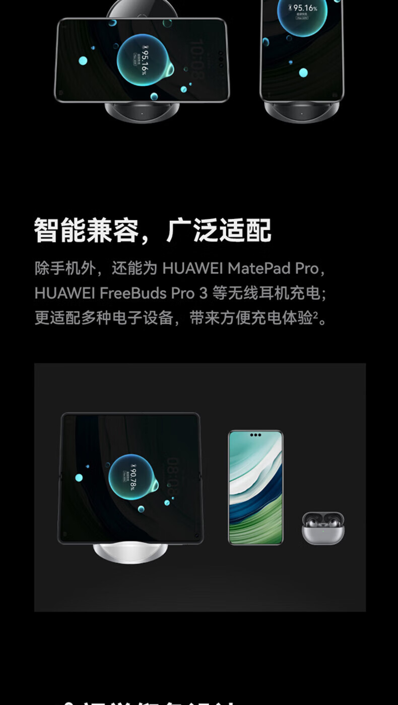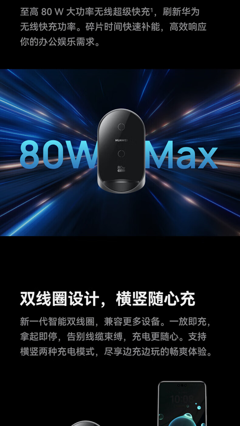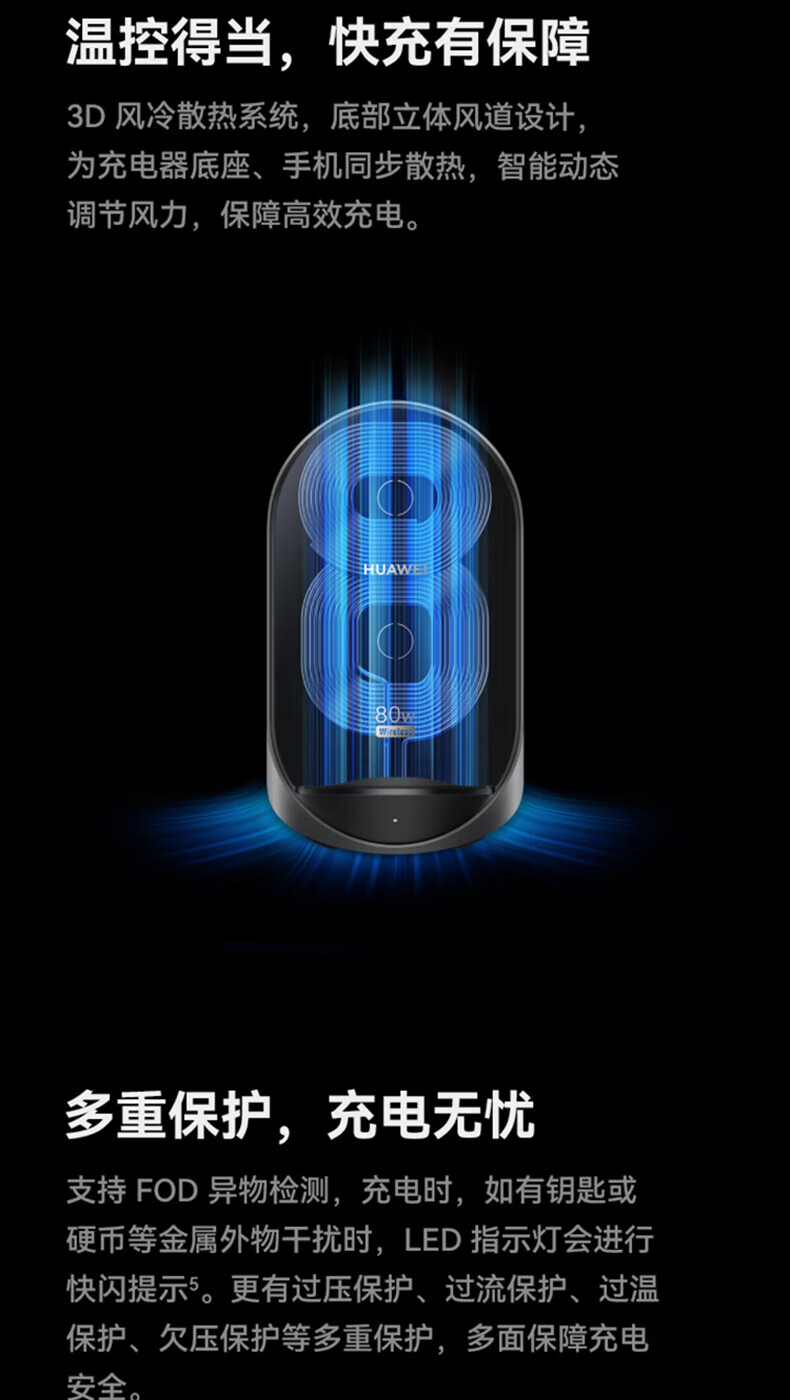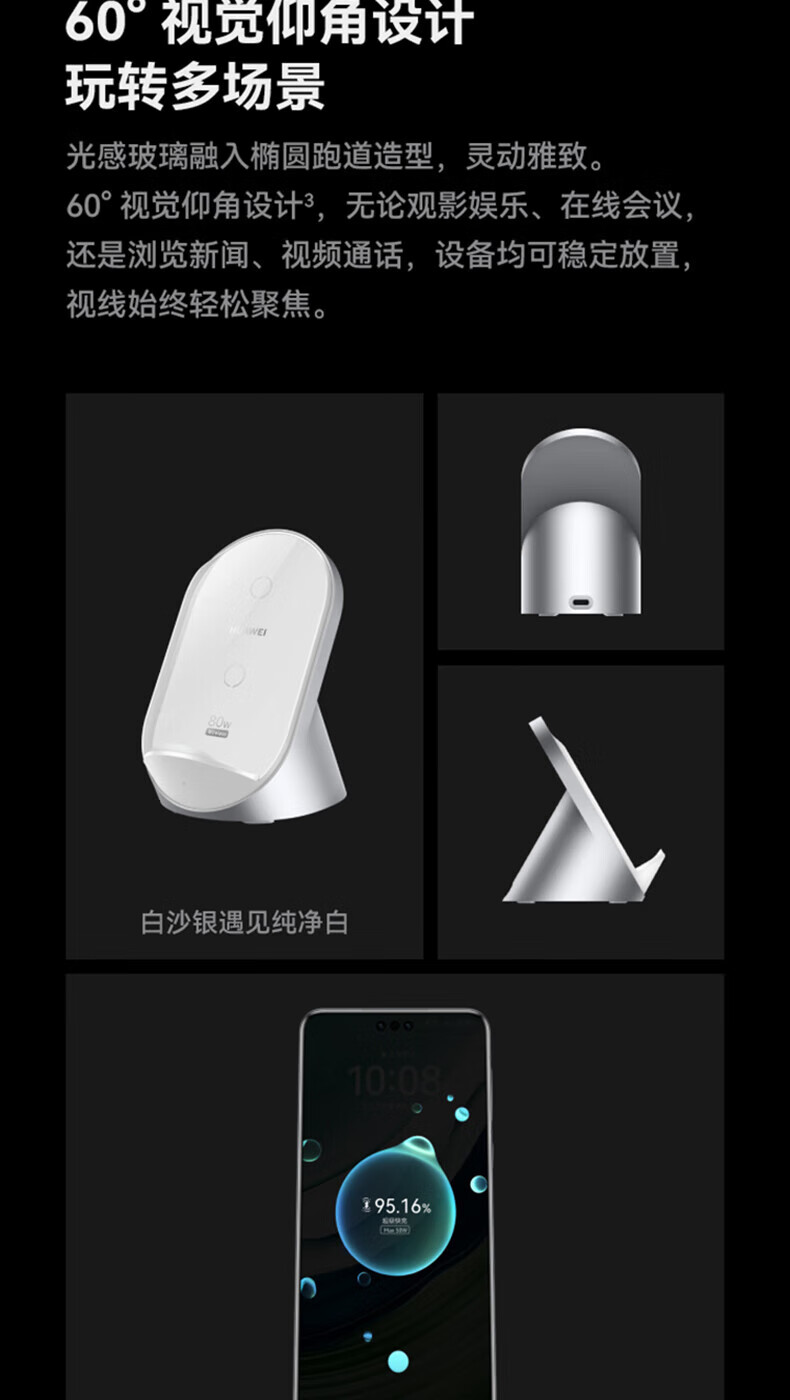• 商品名称:华为HUAWEI 立式无线充电器(Max 80W) 适用机Mate60Pro/Pocket 2折叠机华为手机平板耳机 白沙银 W081 无线充电器 /个
