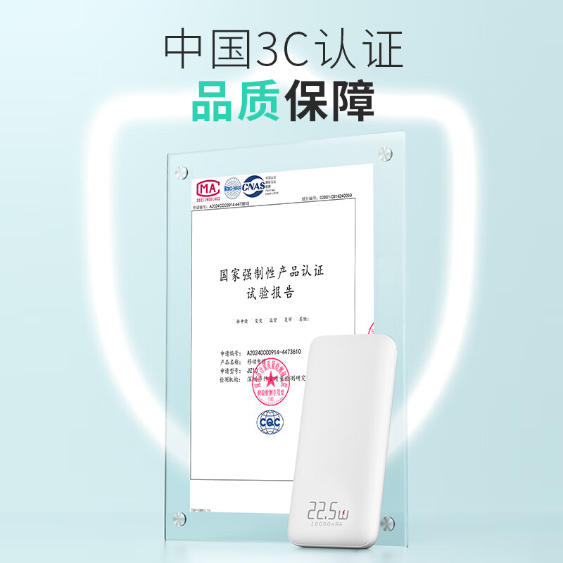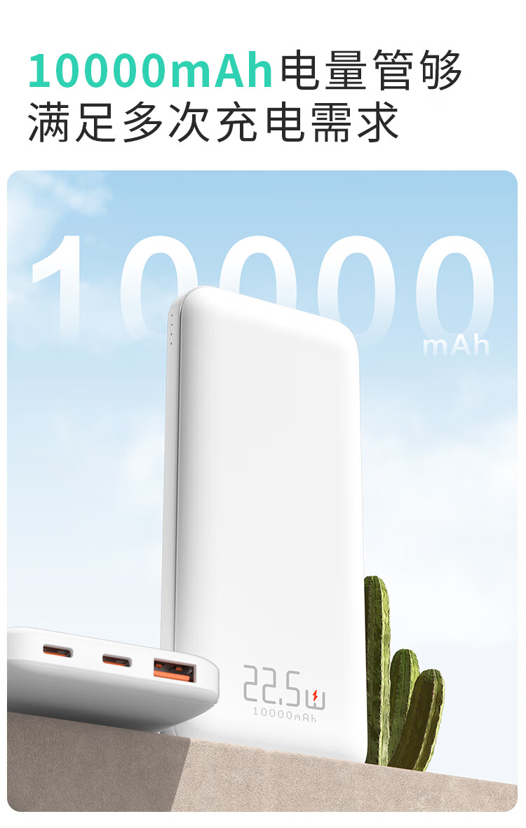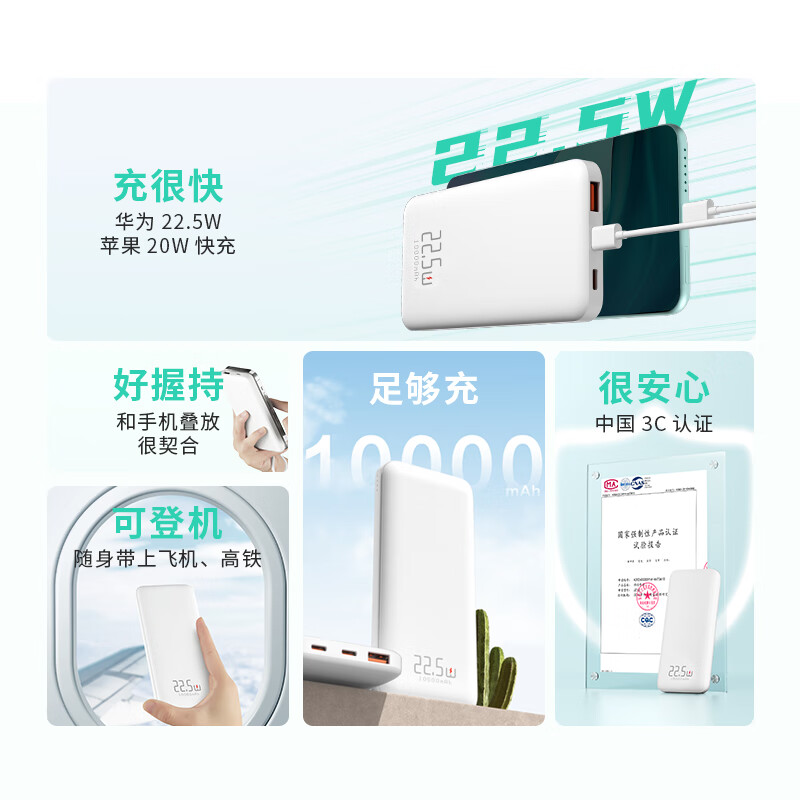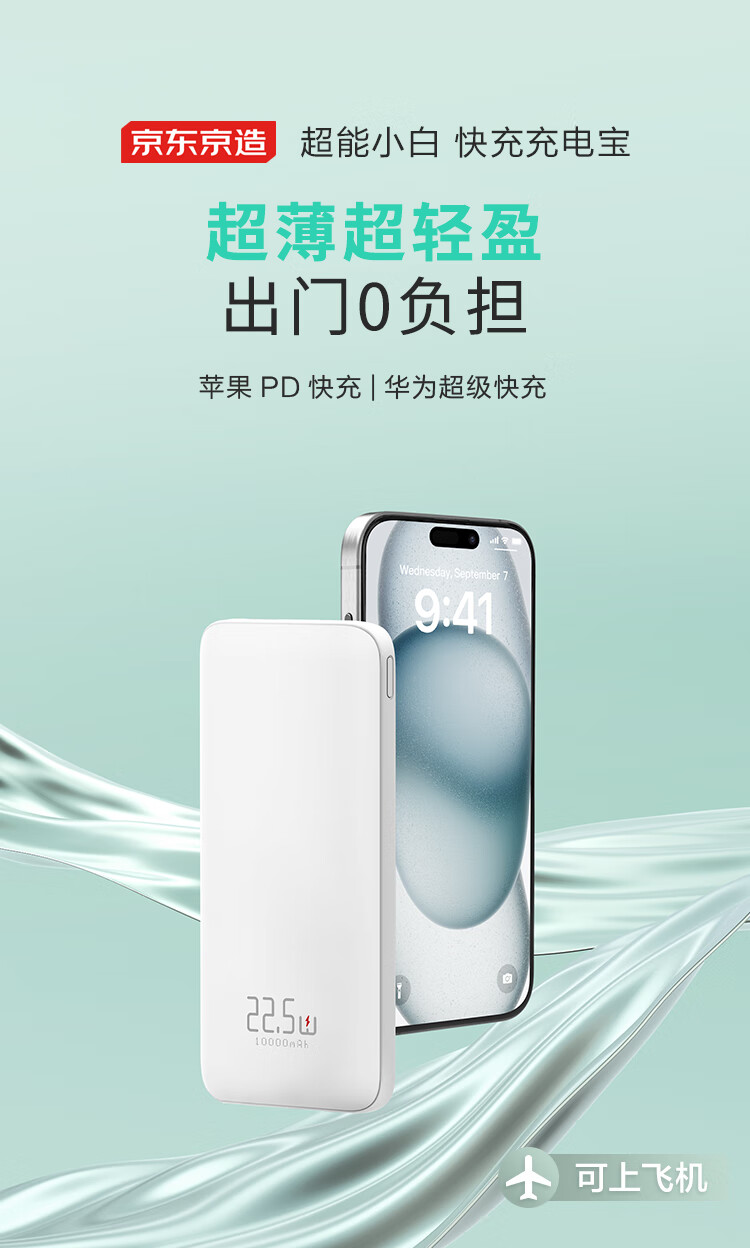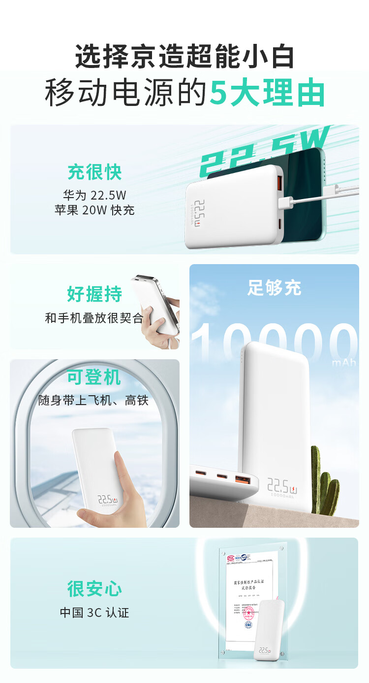 • 商品名称:京东京造22.5W超级快充轻薄便携充电宝10000毫安时3c认证可上飞机京东自营移动电源适用苹果17华为小米荣耀 JZ10/个