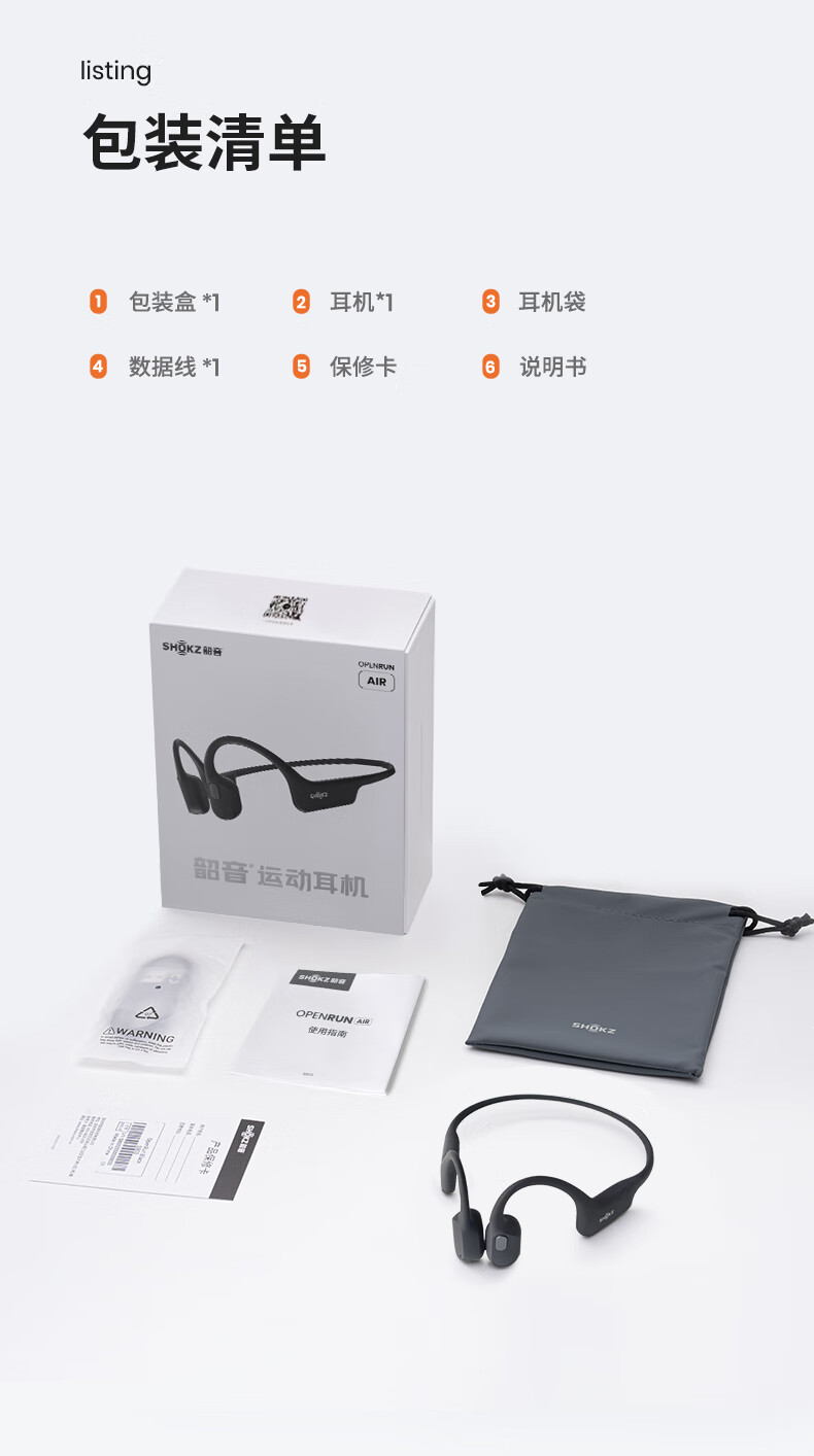 包装清单: 韶音耳机x1、耳机袋x1、数据线x1、保修卡x1、说明书x1;