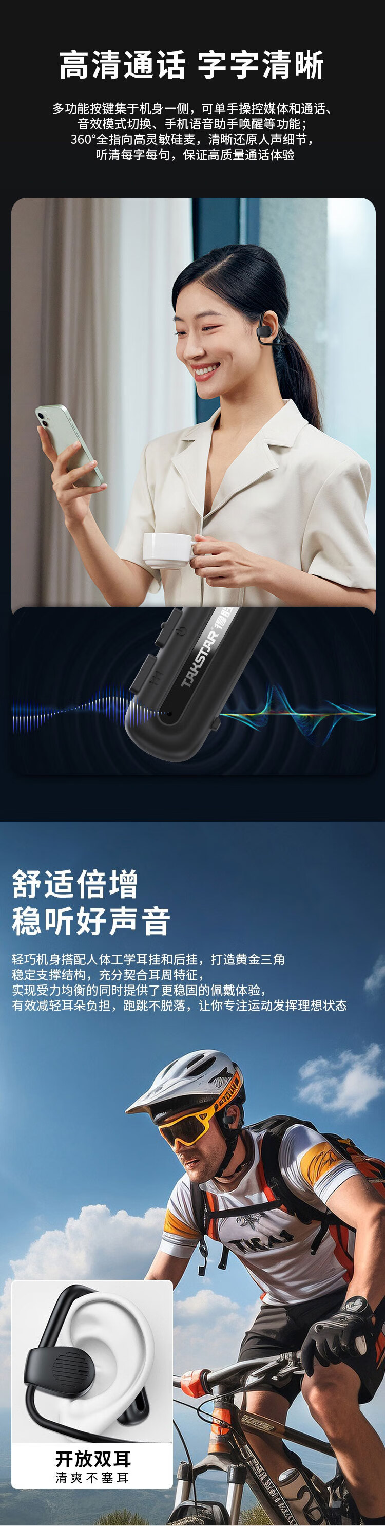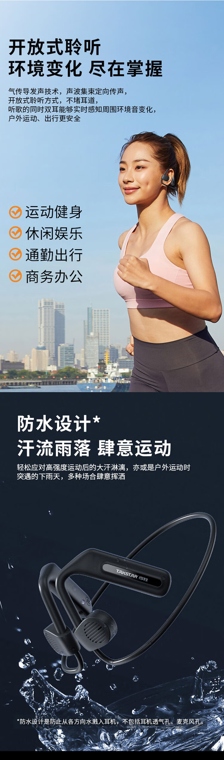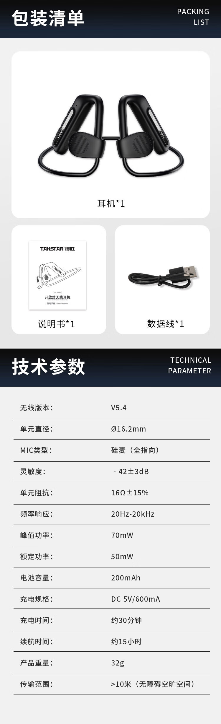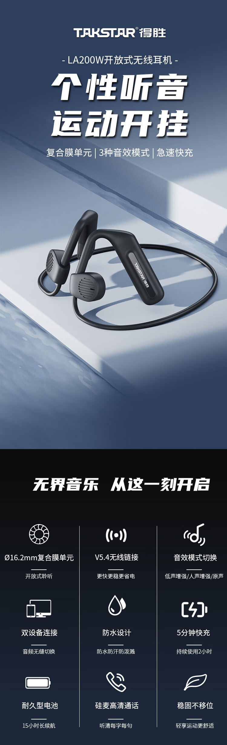 • 商品名称:得胜(TAKSTAR)LA200W 开放式无线耳机 复合膜单元 3种音效模式 急速快充 防水长续航 音乐鉴赏户外运动 只 LA200W/台