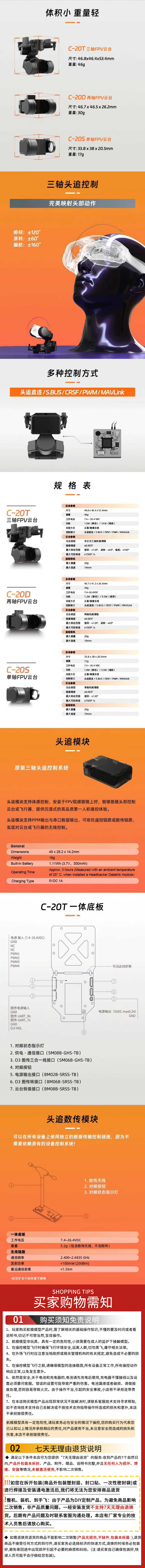 • 商品名称:先飞 无人机C-20T三轴FPV云台支持大疆O3Walksnail相机头追套餐11:基础款 O3版+头追无线套装 C-20T/套