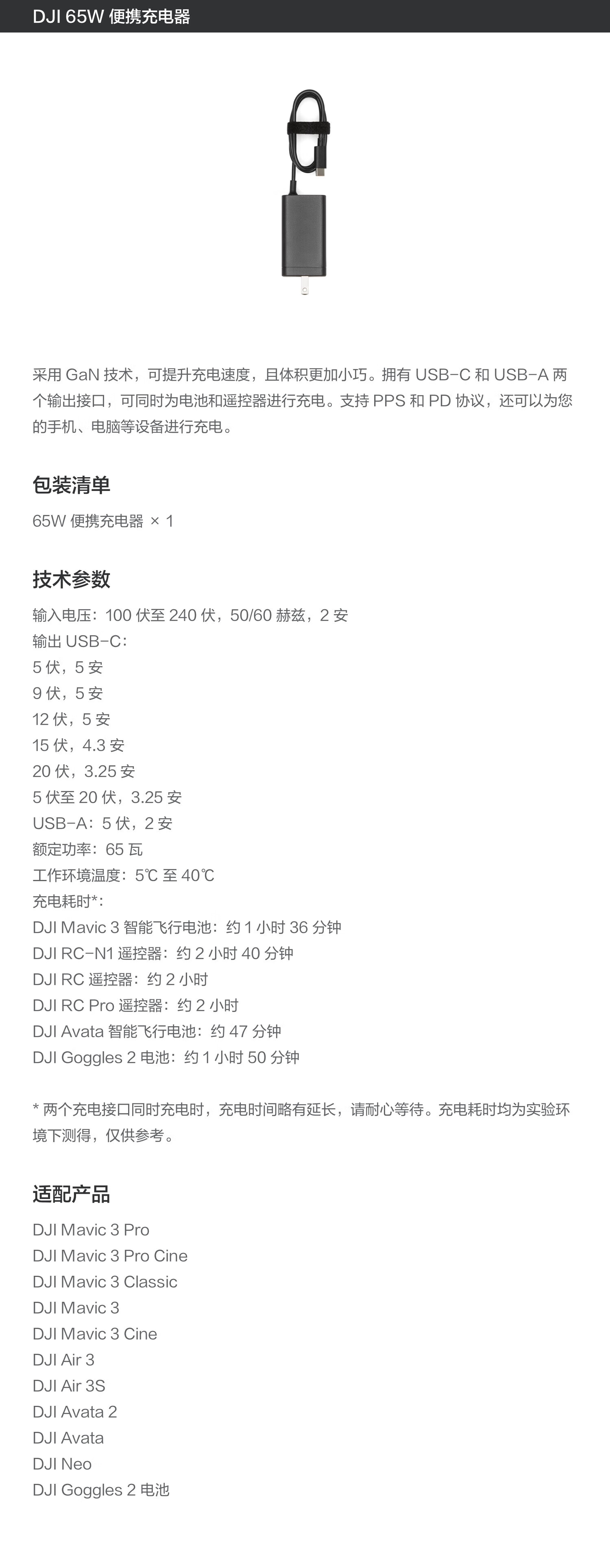 商品名称: 大疆DJI 65W 便携充电器适配DJI Neo/Avata 2/Mini 4 Pro/Air 3/Air 3S/DJI Mavic 3系列 AIR 3S/台