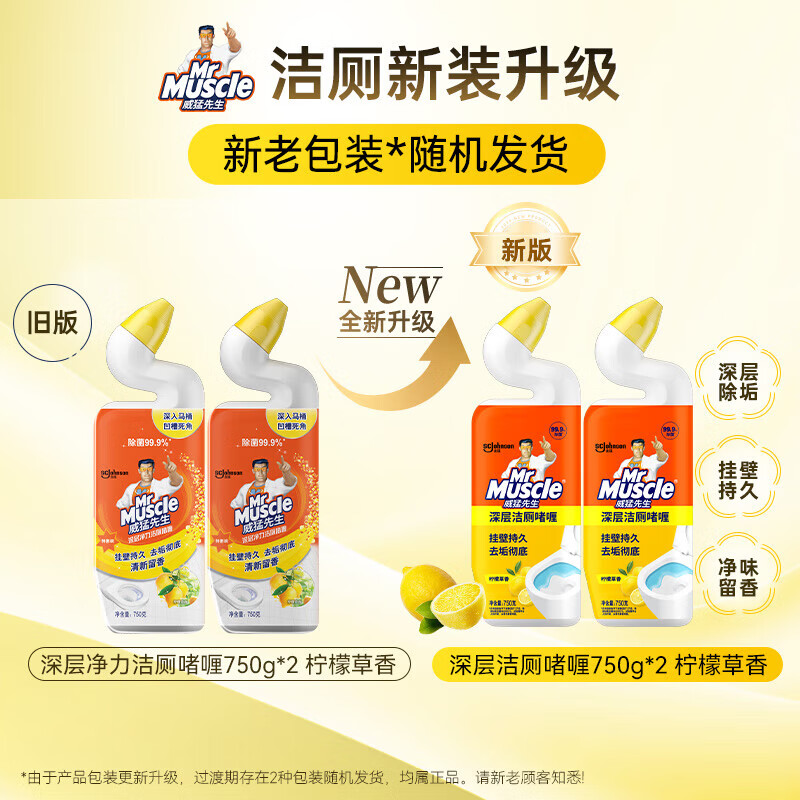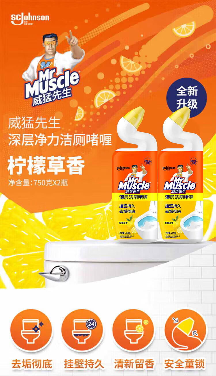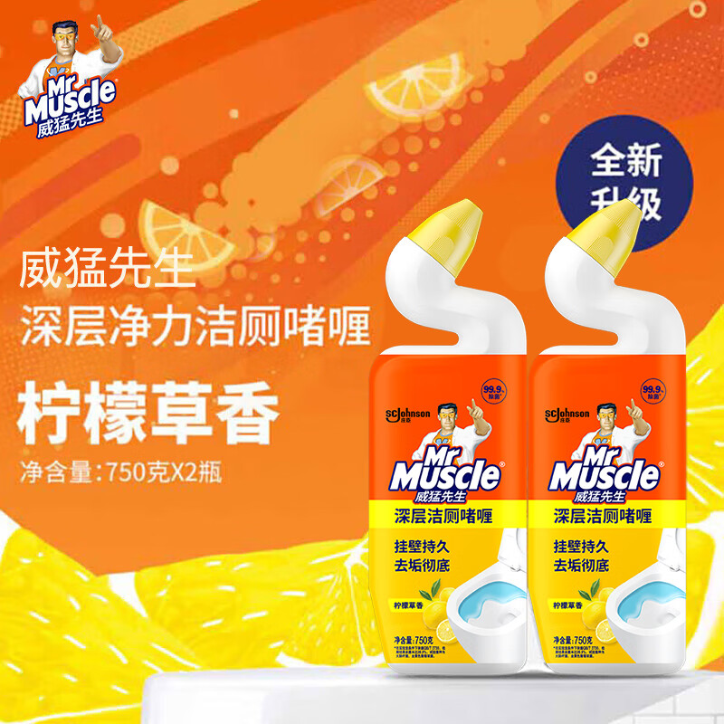 家庭清洁/纸品  > 家庭环境清洁  > 洁厕灵  >  威猛先生/Mr Muscle  >  威猛先生(Mr Muscle)洁厕灵 750g*2瓶 柠檬草香 洁厕液厕所马桶除垢去渍去异味 洁厕液 (柠檬草香) 双包装 750g*2 厕所清洁 量贩装/组