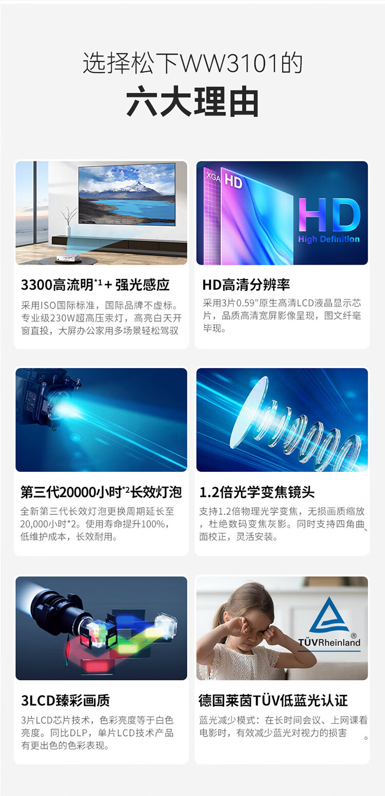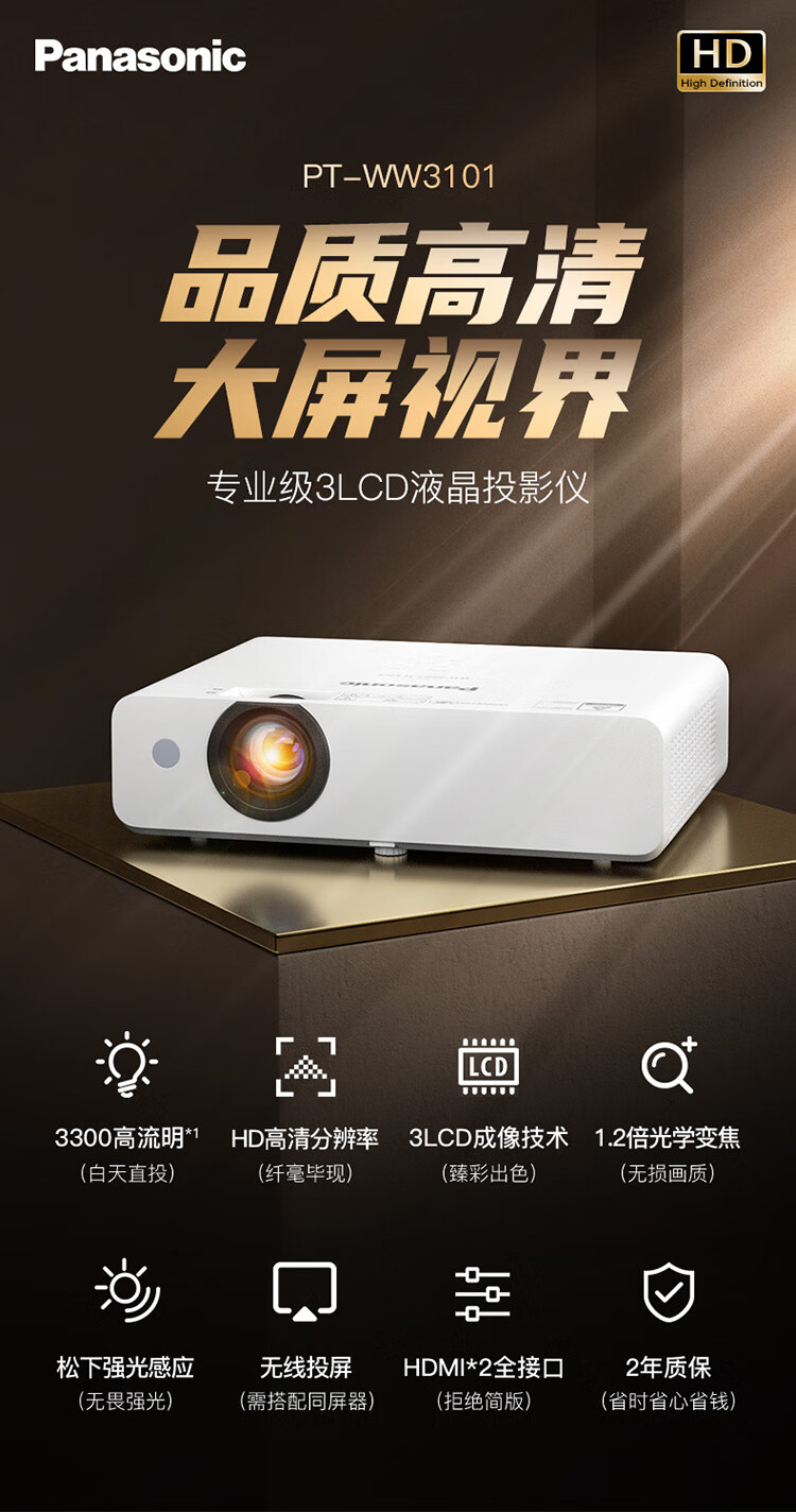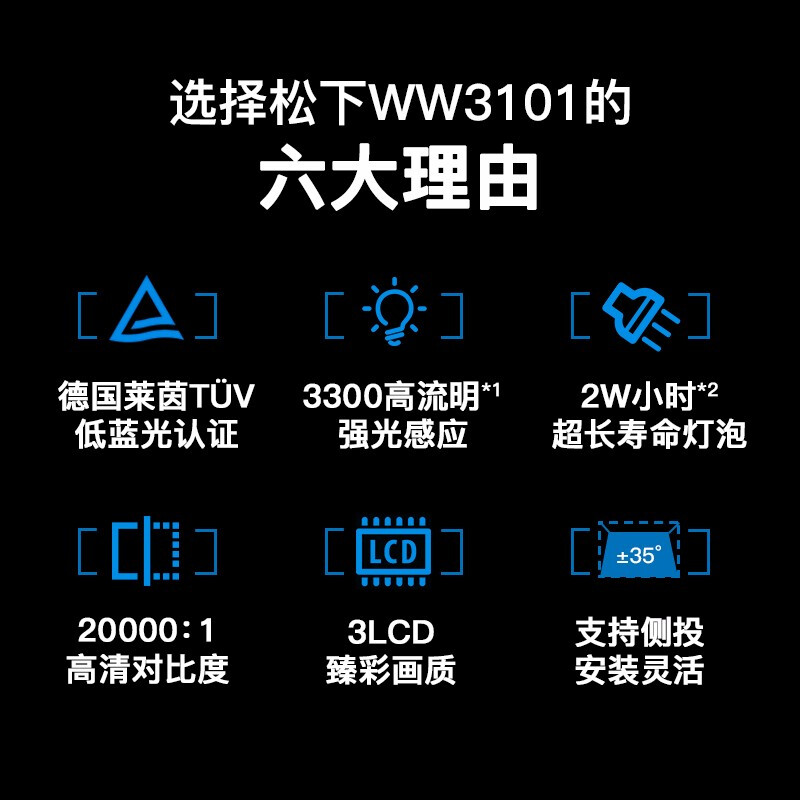 • 商品名称:松下(Panasonic)PT-WW3101 投影仪办公家用家庭影院电视客厅卧室 白天培训会议专用投影机(高清WXGA 3300流明) PT-WW3101/台
