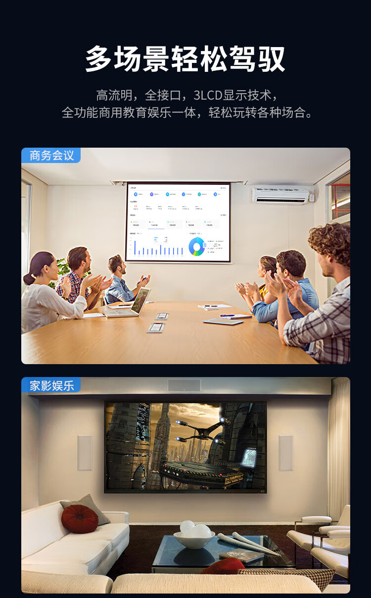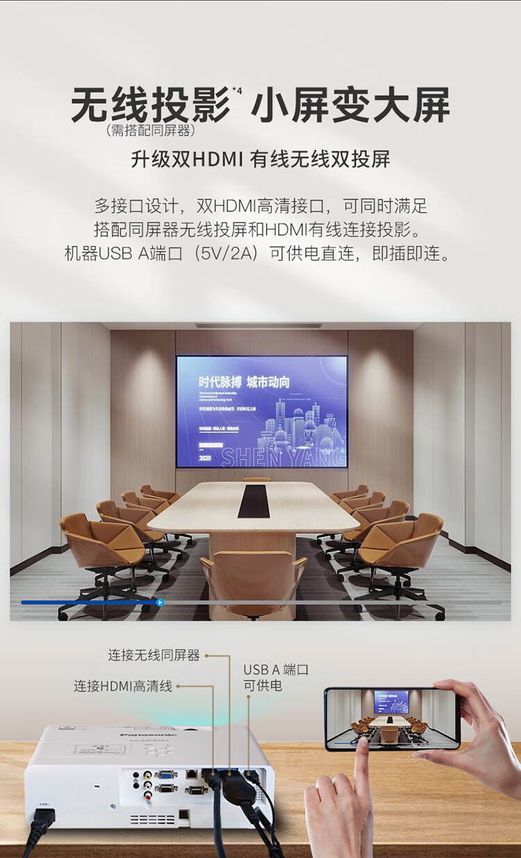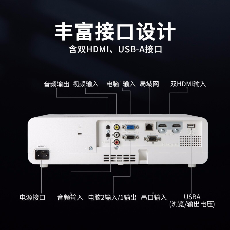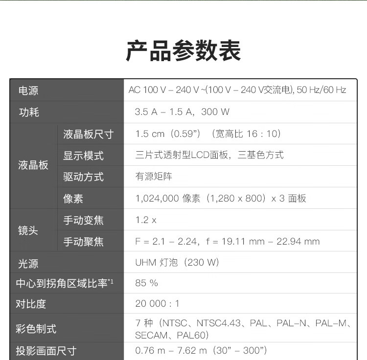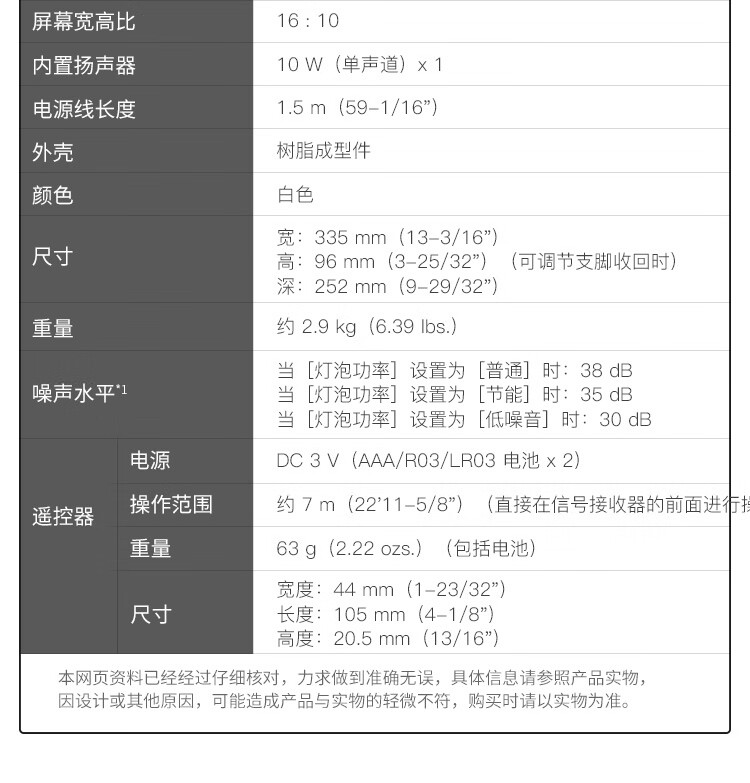 包装清单: 投影机x1,无线遥控器单元x1,电源线x1,使用说明书x1,保修卡x1,电池(R03/LR03/AAA型)x 2