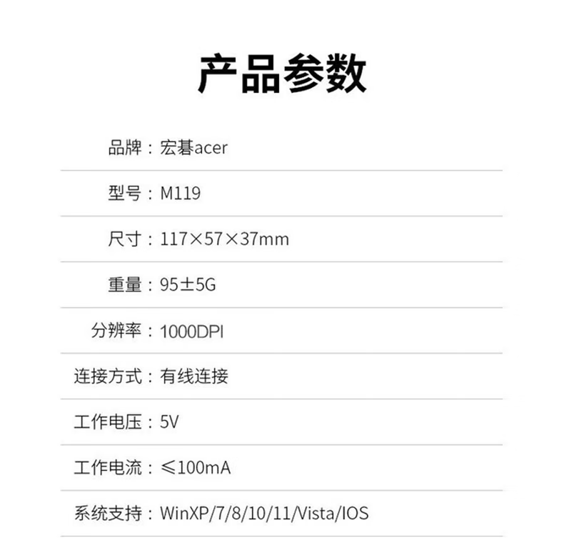 • 商品名称:宏碁优跃 M119无声黑色鼠标 优跃/台